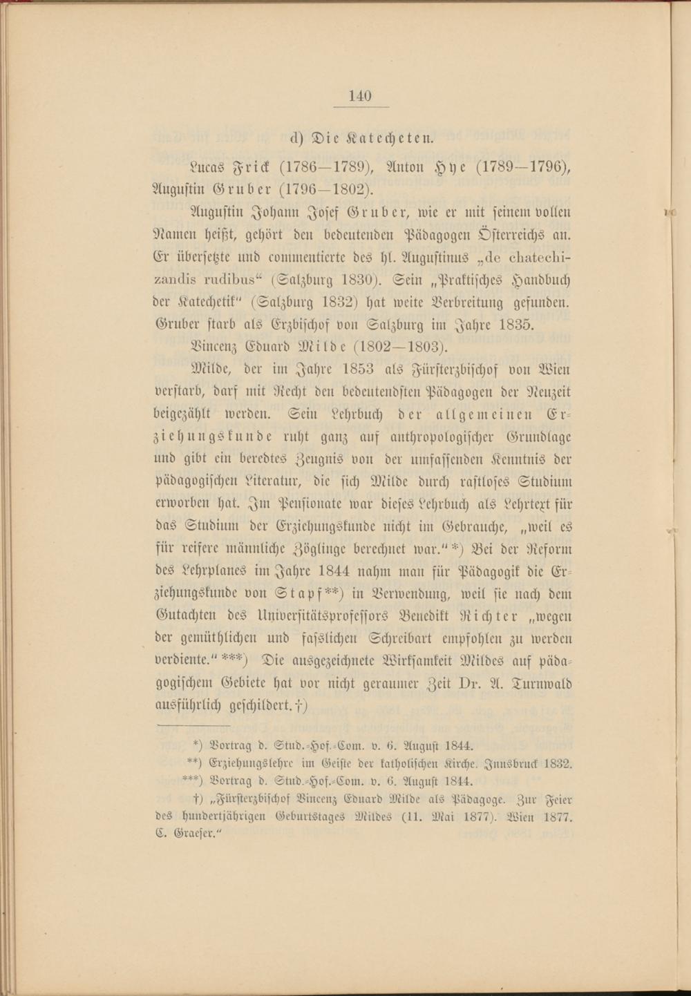 Milde, der im Jahre 1853 als Fürsterzbischof von Wien verstarb, darf mit Recht den bedeutendsten Pädagogen der Neuzeit beigezählt werden. Sein Lehrbuch der allgemeinen Er- ziehungs künde ruht ganz auf anthropologischer Grundlage und gibt ein beredtes Zeugnis von der umfassenden Kenntnis der pädagogischen Literatur, die sich Milde durch rastloses Studium erworben hat. Im Pensionate war dieses Lehrbuch als Lehrtest für das Studium der Erziehungskunde nicht im Gebrauche, „weil es für reifere männliche Zöglinge berechnet war." *) Bei der Reform des Lehrplanes im Jahre 1844 nahm man für Pädagogik die Erziehungskunde von Stapf**) in Verwendung, weil sie nach dem Gutachten des Universitütsprvfessors Benedikt Richter „wegen der gemüthlichen und fasslichen Schreibart empfohlen zu werden verdiente." ***) Die ausgezeichnete Wirksamkeit Mildes auf pädagogischem Gebiete hat vor nicht geraumer Zeit 1)i-. A. Turnwald ausführlich geschildert. 7 )