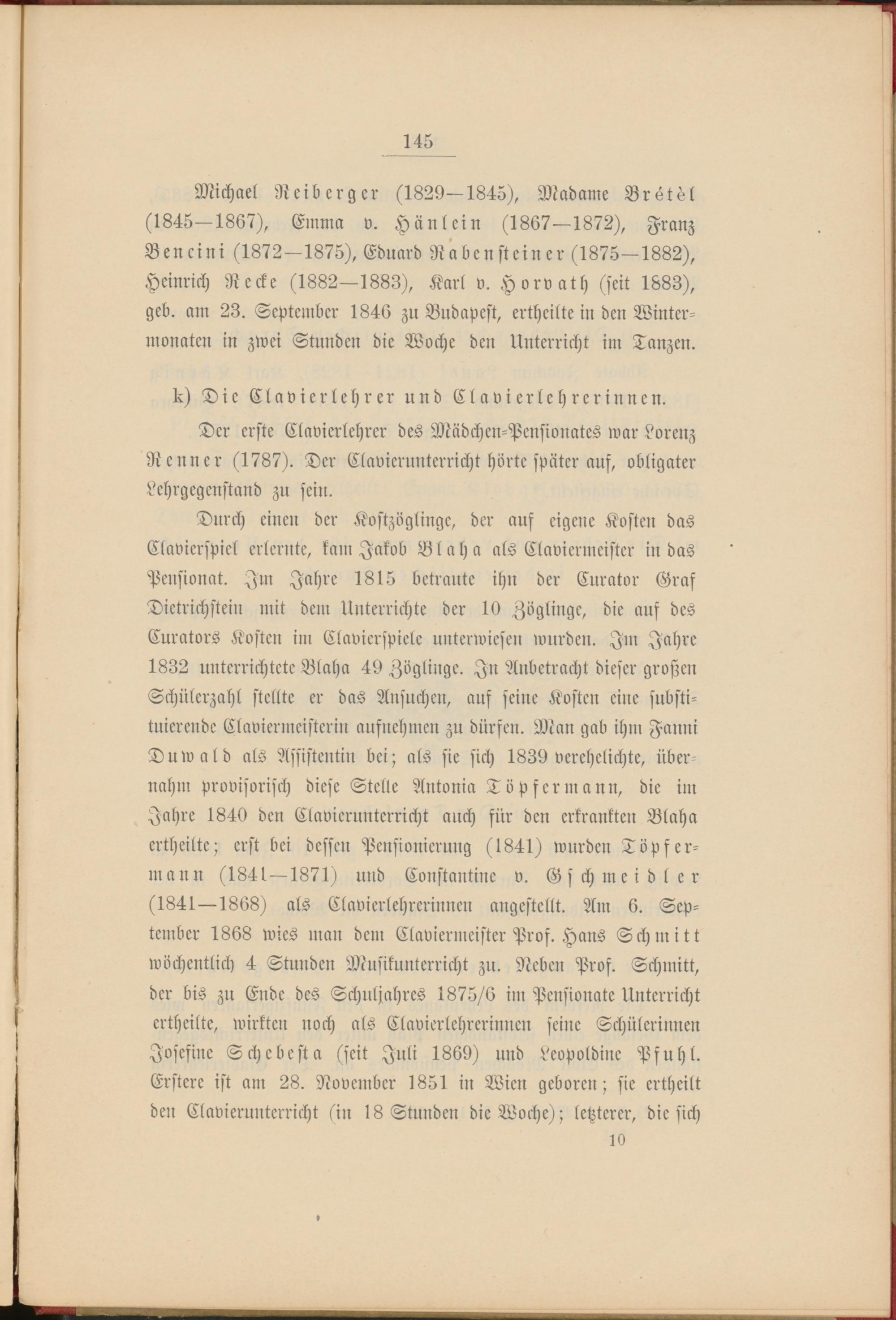Durch einen der Kostzöglingc, der auf eigene Kosten das Clavierspiel erlernte, kam Jakob Blaha als Claviermeister in das Pensionat. Im Jahre 1815 betraute ihn der Kurator Graf Dietrichstein mit dem Unterrichte der 10 Zöglinge, die auf des Curators Kosten im Clavierspiele unterwiesen wurden. Im Jahre 1832 unterrichtete Blaha 49 Zöglinge. In Anbetracht dieser großen Schülerzahl stellte er das Ansuchen, auf seine Kosten eine substituierende Claviermeisterin aufnehmen zu dürfen. Man gab ihm Fanni Duwald als Assistentin bei; als sie sich 1839 verehelichte, übernahm provisorisch diese Stelle Antonia Töpfer mann, die im Jahre 1840 den Klavierunterricht auch für den erkrankten Blaha ertheilte; erst bei dessen Pensionierung (1841) wurden Töpfermann (1841 — 1871) und Konstantine v. Gschmeidler (1841—1868) als Clavierlehrerinnen angestellt. Am 6. September 1868 wies man dem Claviermeister Pros. Hans Schmitt wöchentlich 4 Stunden Musikunterricht zu. Neben Pros. Schmitt, der bis zu Ende des Schuljahres 1875/6 im Pensionate Unterricht ertheilte, wirkten noch als Clavierlehrerinnen seine Schülerinnen Jvsesine Schebesta (seit Juli 1869) und Nopoldine Pfuhl. Erstere ist am 28. November 1851 in Wien geboren; sie ertheilt den Claviernnterricht (in 18 Stunden die Woche); letzterer, die sich