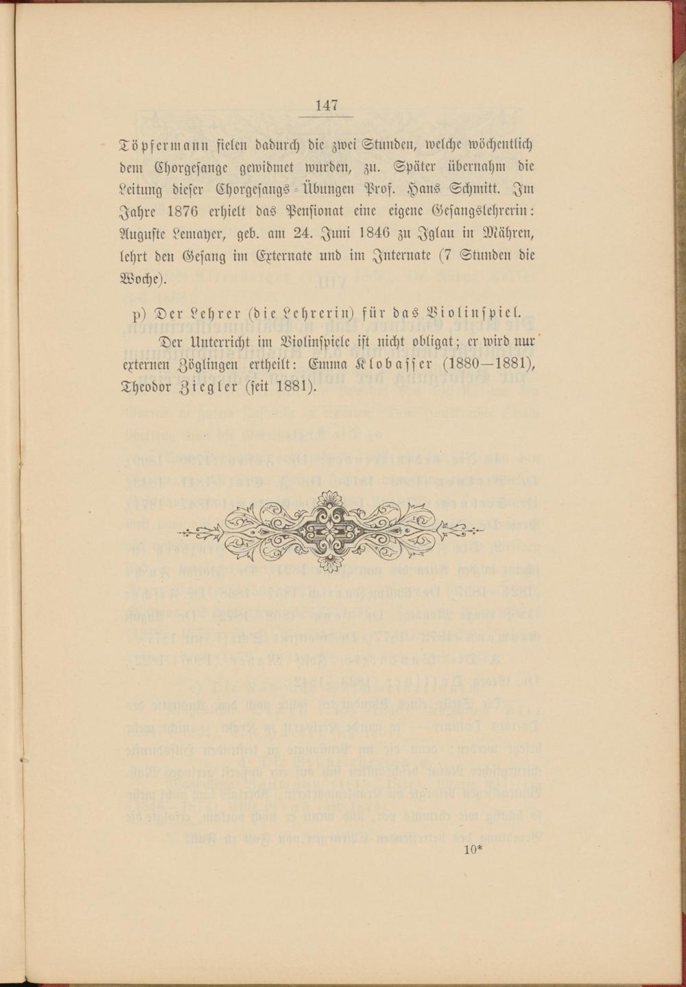 Der Unterricht im Biolinspiele ist nicht obligat; er wird nur' externen Zöglingen ertheilt: Emma Klo dass er (1880—1881), Theodor Ziegler (seit 1881).