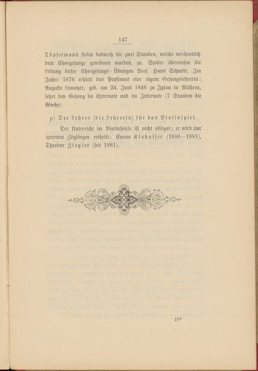 Töpfermann fielen dadurch die zwei Stunden, welche wöchentlich dem Chorgesange gewidmet wurden, zu. Später übernahm die Leitung dieser Chorgesangs - Übungen Pros. Hans Schmitt. Im Jahre 1876 erhielt das Pensionat eine eigene Gesangslehrerin: Auguste Lemayer, geb. am 24. Juni 1846 zu Jglau in Mähren, lehrt den Gesang im Externste und im Internate (7 Stunden die Woche).