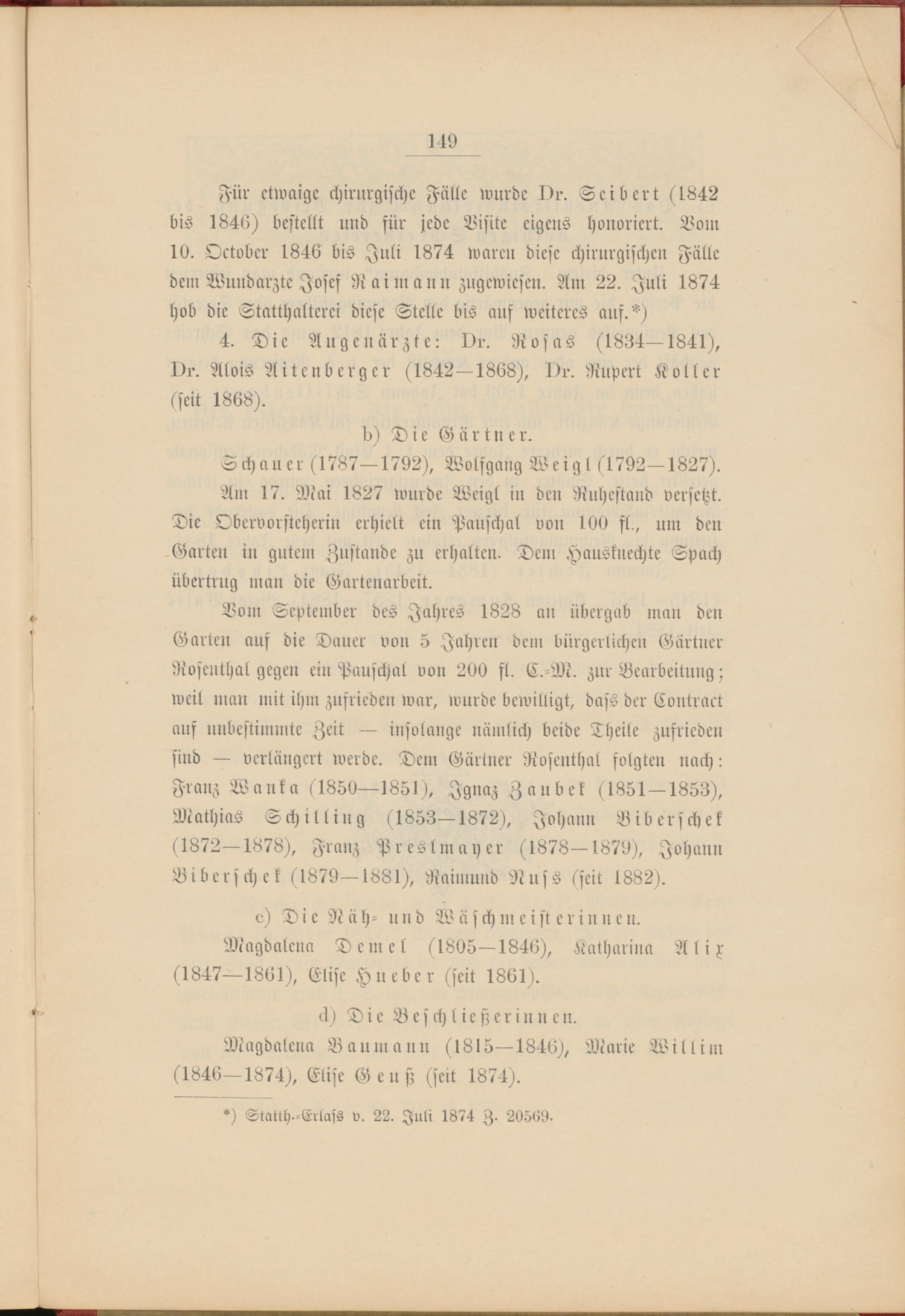 Für etwaige chirurgische Fälle wurde Dr. Seibert (1842 bis 1846) bestellt uud für jede Bisite eigens honoriert. Bom 10. October 1846 bis Juli 1874 waren diese chirurgischen Fälle dem Wundärzte Josef Raimann zugewiesen. Am 22. Juli 1874 hob die Statthalters diese Stelle bis auf weiteres auf.*)
