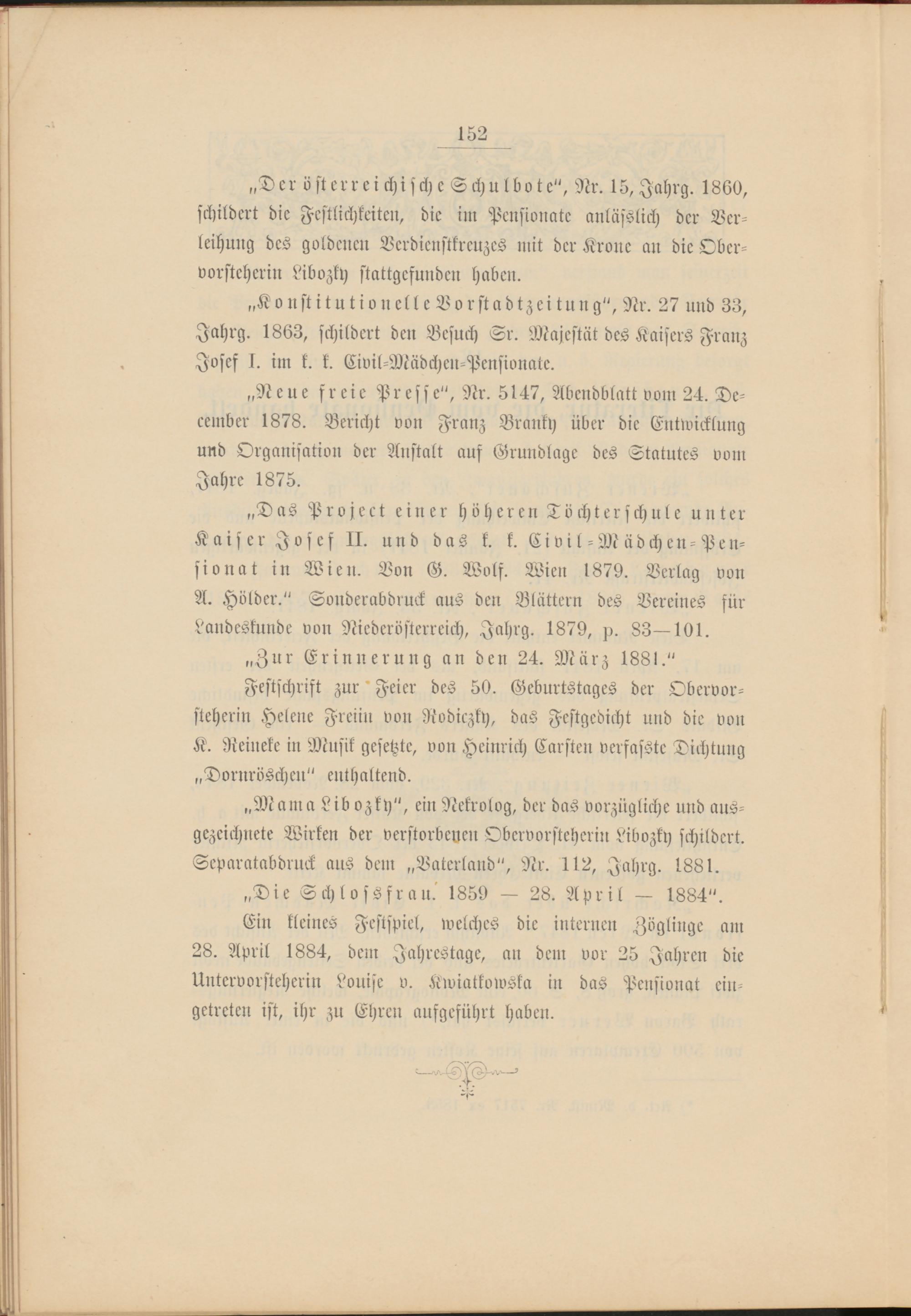 „D cr österreichischc Schulbot e", SLr. 15, Jahrg. 1860, schildert die Festlichkeiten, die im Pensionate anlüsslich der Verleihung des goldenen Verdicnstkrcuzes mit der Krone an die Obervorsteherin Libozky stattgefunden haben.
