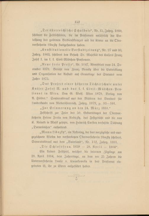 „Mama Lib ozky", ein Nekrolog, der das vorzügliche und ausgezeichnete Wirken der verstorbenen Obervorsteherin Libozky schildert. Separatabdruck aus dem „Vaterland", Nr. 112, Jahrg. 1881.