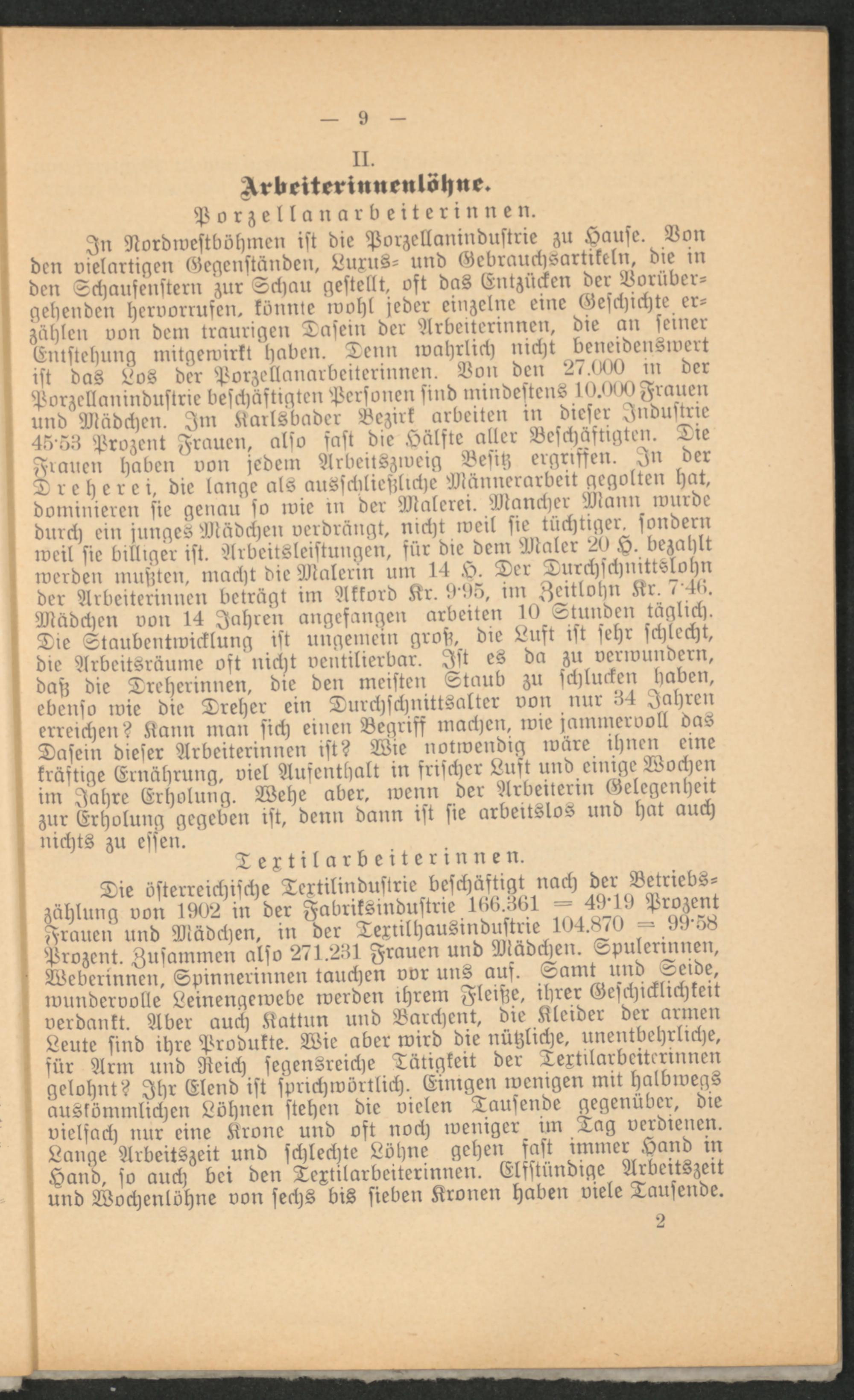 In Nordwestbühmen ist die Porzellanindustrie zu Hause. Van den vielartigen ttzcgenständeu, Luxus- und Gebrauchsartikeln, die in den Schaufenstern zur Schau gestellt, oft das Entzücken der Vorübergehenden hervorrufen, könnte ivohl jeder einzelne eine Geschichte erzählen von dein traurigen Tasein der Arbeiterinnen, die an seiner i Entstehung mitgewirkt haben. Tenn wahrlich nicht beneidenswert ist das Los der Porzcllanarbeitcrinncn. Bon den 27.000 in der Porzellanindustrie beschäftigten Personen sind mindestens 10.000 Frauen ; und Mädchen. Im Karlsbader Bezirk arbeiten in dieser Industrie ^ Prozent Frauen, also fast die Hälfte aller Beschäftigten. Tie