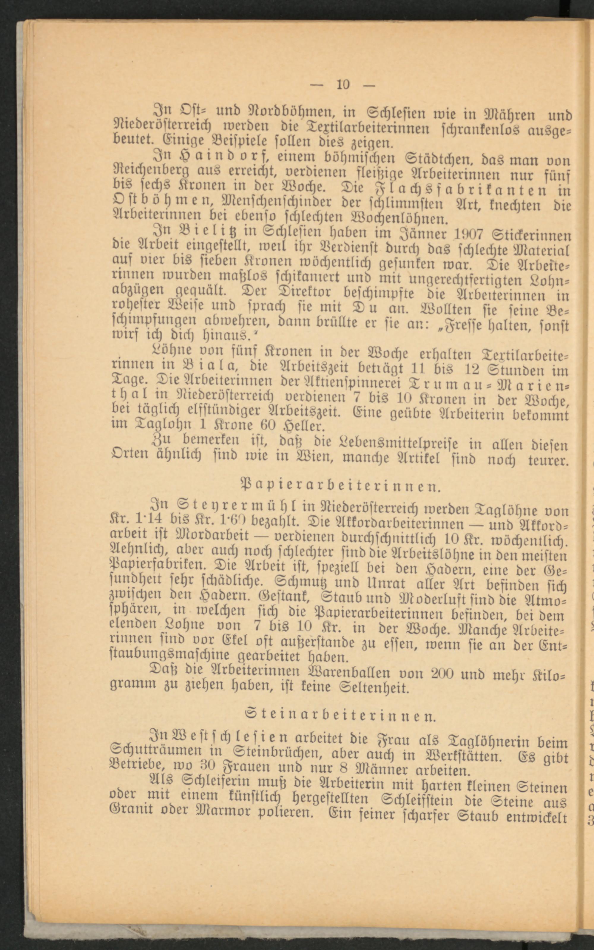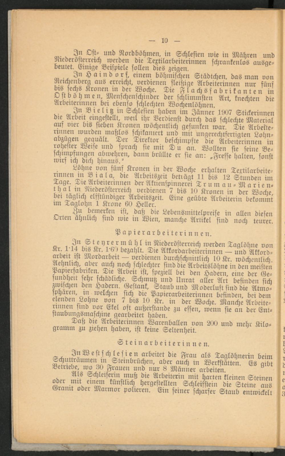 In Bielitz in Schlesien haben im Jänner 1007 Stickerinnen die Arbeit eingestellt, weil ihr Verdienst durch das schlechte Material auf vier bis sieben Kronen wöchentlich gesunken war. Die Arbeiterinnen wurden maßlos schikaniert und mit ungerechtfertigten Lohnabzügen gequält. Der Direktor beschimpfte die Arbeiterinnen in rohester Weise und sprach sie mit D u an. Wollten sie seine Beschimpfungen abwehren, dann brüllte er sie an: »Fresse halten, sonst wirf ich dich hinaus.'