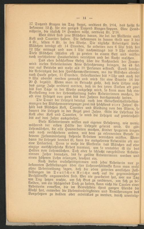 Weit übler sind jene Mädchen daran, die bei der Meisterin auch Kost und Quartier haben. Sie bekommen in barein Geld nur 8 bis 4 Kr., selten l! Kr. in der Woche. Die tägliche Arbeitszeit dieser Mädchen beträgt ost 14 Stunden, sie arbeiten von 6 Uhr srüh bis 12 Uhr mittags und von 1 Uhr nachmittags bis 9 Uhr abends. Diese Mädchen schlafen oft zu zweien in einem Bett und müssen noch verschiedene Hausarbeiten verrichten und bei Nacht waschen.