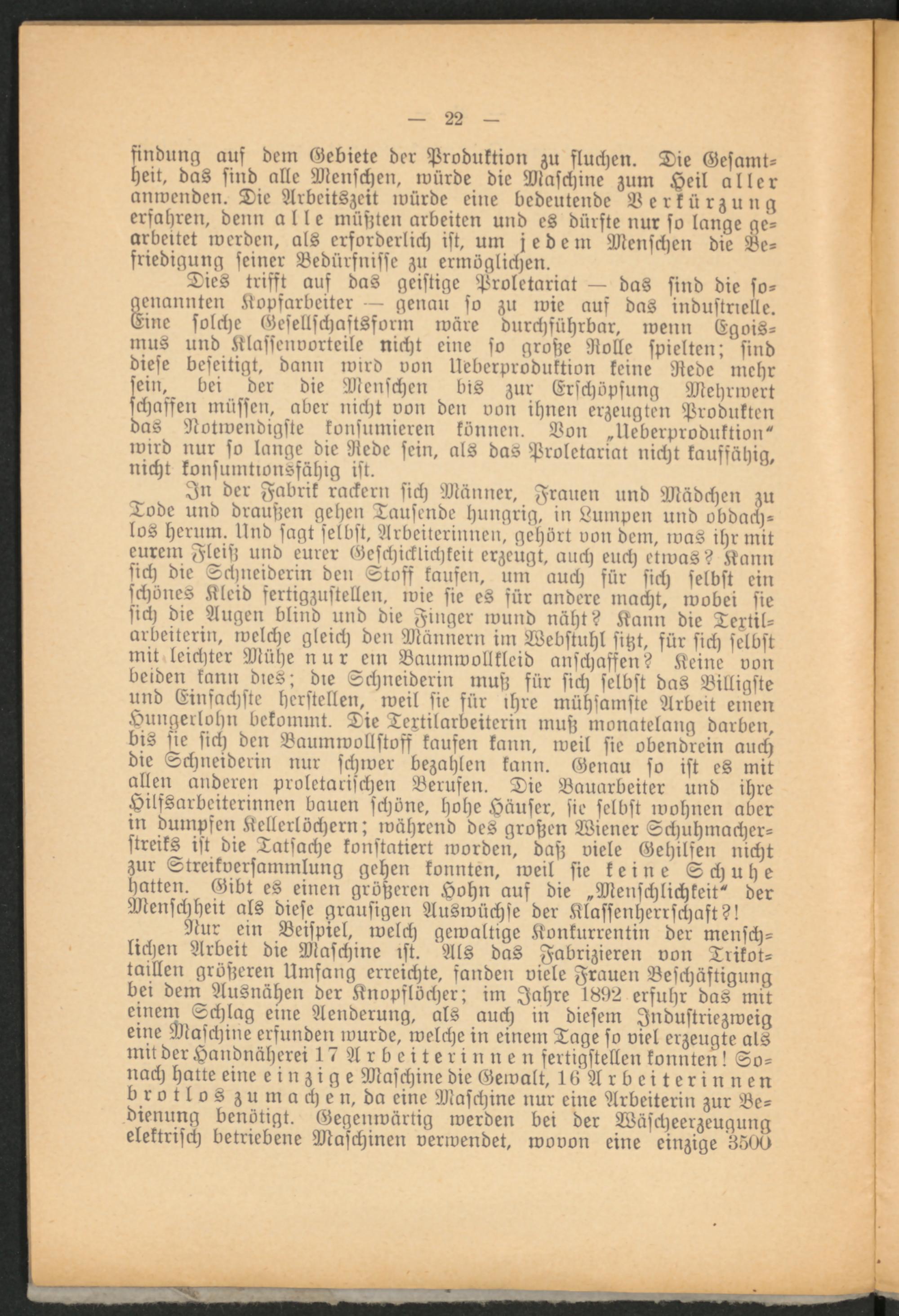 In der Fabrik rackern sich Männer. Frauen und Mädchen zu Tode und draußen gehen Tausende hungrig, in Lumpen und obdachlos herum. Und sagt selbst, Arbeiterinnen, gehört von dem, was ihr mit eurem Fleiß und eurer Geschicktichkeit erzeugt, auch euch etwas? Kann sich die Schneiderin den Stoff kaufen, um auch für sich selbst ein schönes Kleid fertigzustellen, wie sie es für andere macht, wobei sie sich die Augen blind und die Finger wund näht? Kann die Textilarbeiterin, welche gleich den Männern im Webstuhl sitzt, für sich selbst mit leichter Mühe nur ein Baumwollkleid anschaffen? Keine von beiden kann dies; die Schneiderin muß für sich selbst das Billigste und Einfachste herstellen, weil sie für ihre mühsamste Arbeit einen Hungerlohn bekommt. Die Textilarbeiterin muß monatelang darben, bis sie sich den Baumwollstoff kaufen kann, weil sie obendrein auch die Schneiderin nur schwer bezahlen kann. Genau so ist es mit allen anderen proletarischen Berufen. Die Bauarbeiter und ihre Hilfsarbciterinnen bauen schöne, hohe Häuser, sie selbst wohnen aber in dumpfen Kellerlöchern; während des großen Wiener Schuhmacherstreiks ist die Tatsache konstatiert worden, daß viele Gehilfen nicht zur Slreikversammlung gehen konnten, weil sie keine Schuhe hatten. Gibt es einen größeren Hohn auf die „Menschlichkeit" der Menschheit als diese grausigen Auswüchse der .Klassenherrschaft?!