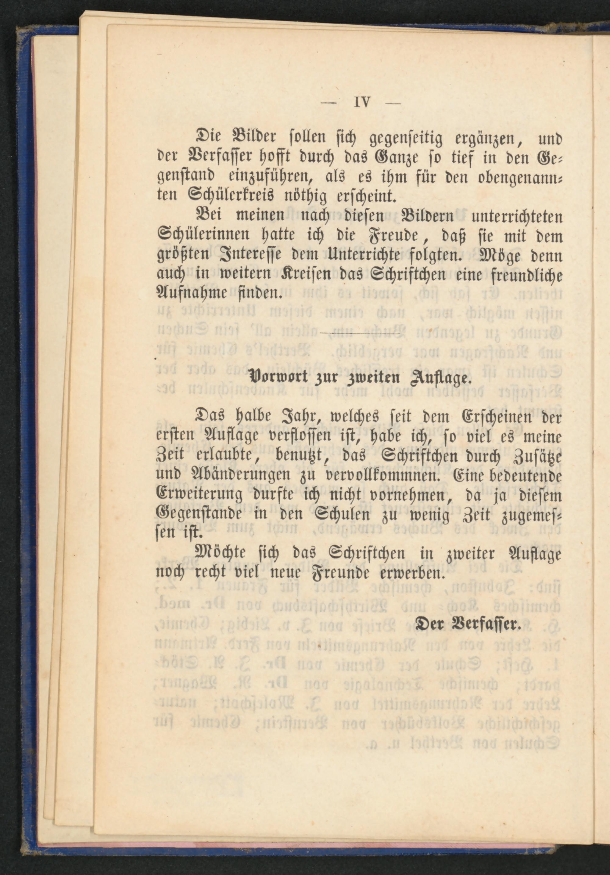 Die Bilder sollen sich gegenseitig ergänzen, und der Verfasser hofft durch das Ganze so tief in den Gegenstand einzuführen, als es ihm für den obengenann- ten Schülerkreis nöthig erscheint.