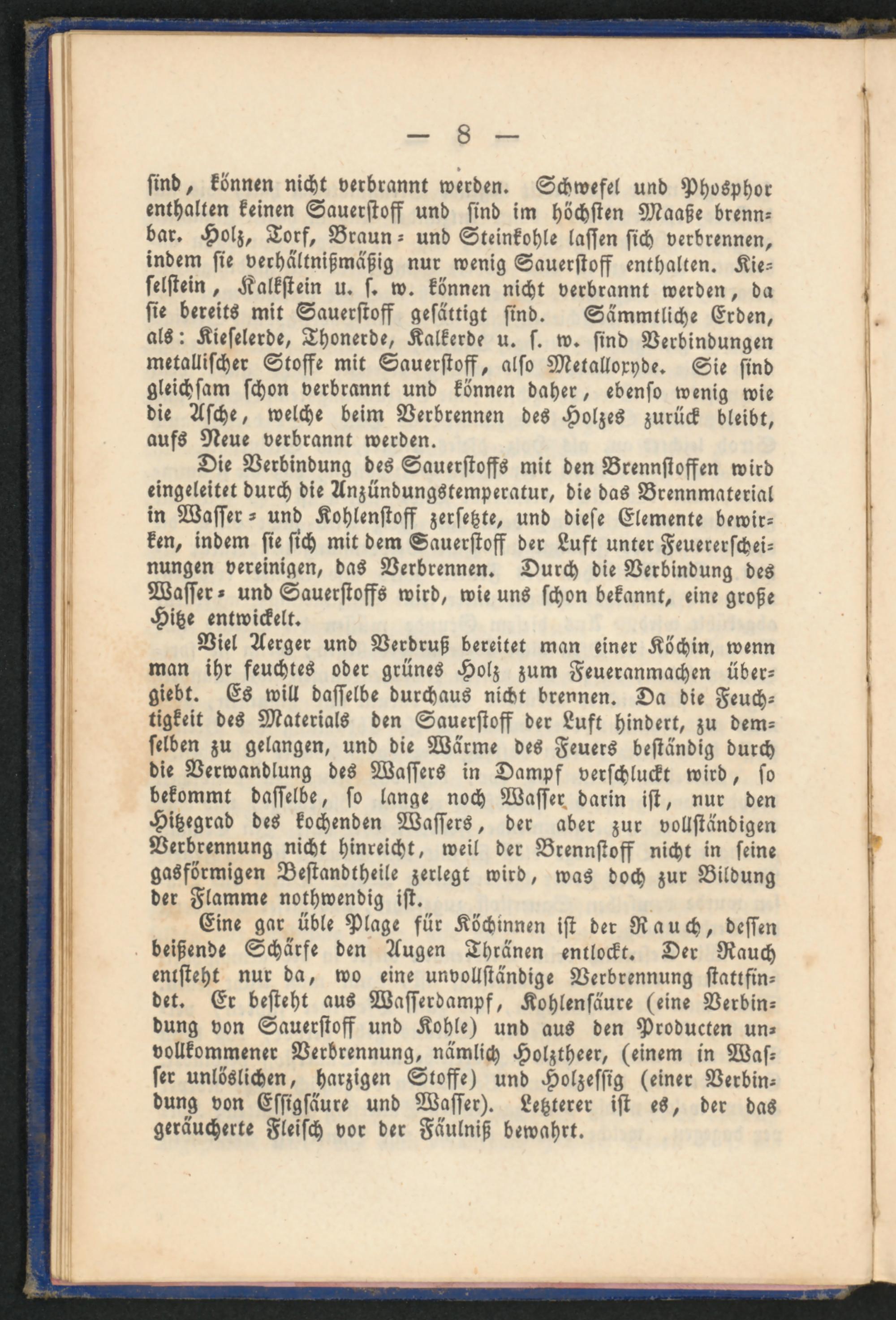 Eine gar üble Plage für Köchinnen ist der Rauch, dessen beißende Schärfe den Augen Thränen entlockt. Der Rauch entsteht nur da, wo eine unvollständige Verbrennung stattfindet. Er besteht aus Wasserdampf, Kohlensäure (eine Verbindung von Sauerstoff und Kohle) und aus den Producten unvollkommener Verbrennung, nämlich Holztheer, (einem in Wasser unlöslichen, harzigen Stoffe) und Holzessig (einer Verbindung von Essigsäure und Wasser). Letzterer ist es, der das geräucherte Fleisch vor der Fäulniß bewahrt.
