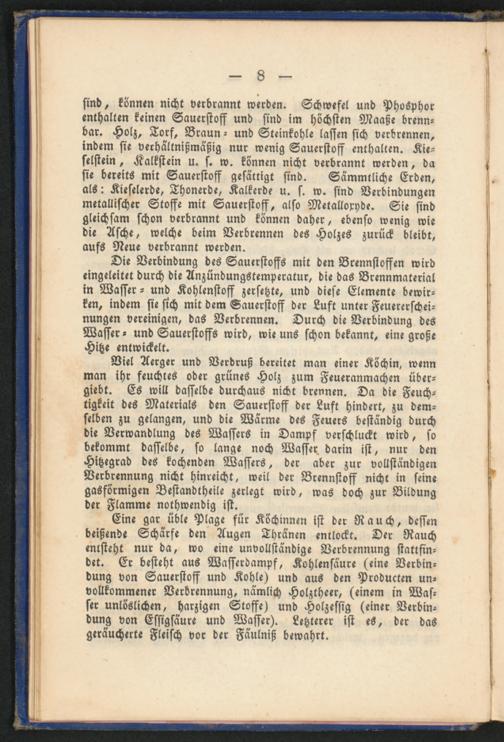 Viel Aerger und Verdruß bereitet man einer Köchin, wenn man ihr feuchtes oder grünes Holz zum Feueranmachen über- giebt. Es will dasselbe durchaus nicht brennen. Da die Feuchtigkeit des Materials den Sauerstoff der Luft hindert, zu demselben zu gelangen, und die Wärme des Feuers beständig durch die Verwandlung des Wassers in Dampf verschluckt wird, so bekommt dasselbe, so lange noch Wasser, darin ist, nur den Hitzegrad des kochenden Wassers, der aber zur vollständigen Verbrennung nicht hinreicht, weil der Brennstoff nicht in seine gasförmigen Bestandtheile zerlegt wird, was doch zur Bildung der Flamme nothwendig ist.