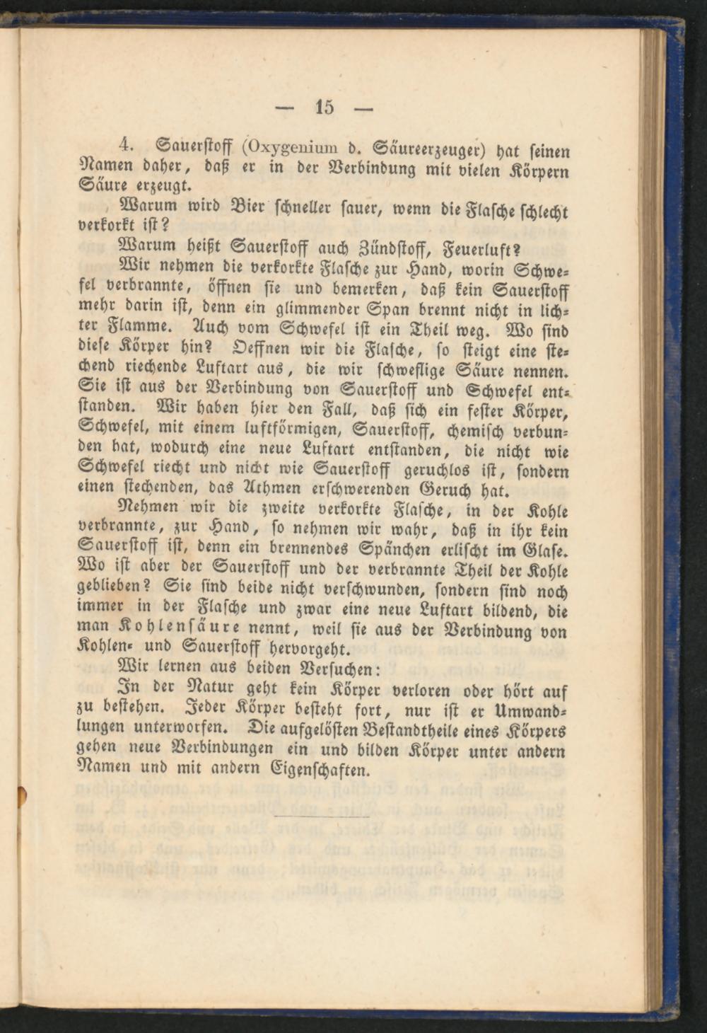 Nehmen wir die zweite verkorkte Flasche, in der Kohle verbrannte, zur Hand, so nehmen wir wahr, daß in ihr kein Sauerstoff ist, denn ein brennendes Spänchen erlischt im Glase. Wo ist aber der Sauerstoff und der verbrannte Theil der Kohle geblieben? Sie sind beide nicht verschwunden, sondern sind noch immer in der Flasche und zwar eine neue Luftart bildend, die man Kohlensäure nennt, weil sie aus der Verbindung von Kohlen- und Sauerstoff hervorgeht.