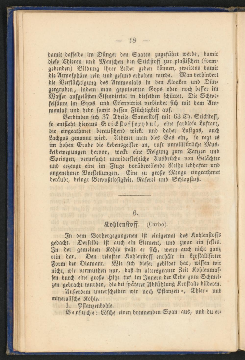 In dem Vorhergegangenen ist einigemal des Kohlenstoffs gedacht. Derselbe ist auch ein Element, und zwar ein festes. In der gemeinen Kohle stellt er sich, wenn auch nicht ganz rein dar. Den reinsten Kohlenstoff enthält in krystallisirter Form der Diamant. Wie sich dieser gebildet hat, wissen wir nicht, wir vermuthen nur, daß in altersgrauer Zeit Kohlenmas- sen durch eine große Hitze tief im Innern der Erde zum Schmelzen gebracht wurden, die bei späterer Abkühlung Krystalle bildeten.