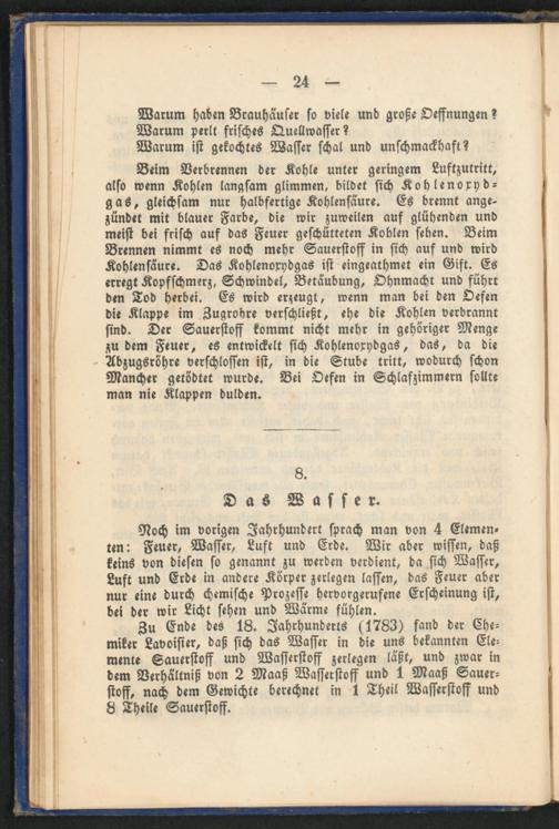 Zu Ende des 18. Jahrhunderts (1783) fand der Che­miker Lavoisier, daß sich das Wasser in die uns bekannten Ele­mente Sauerstoff und Wasserstoff zerlegen läßt, und zwar in dem Verhältniß von 2 Maaß Wasserstoff und 1 Maaß Sauer­stoff, nach dem Gewichte berechnet in 1 Theil Wasserstoff und 8 Theile Sauerstoff.