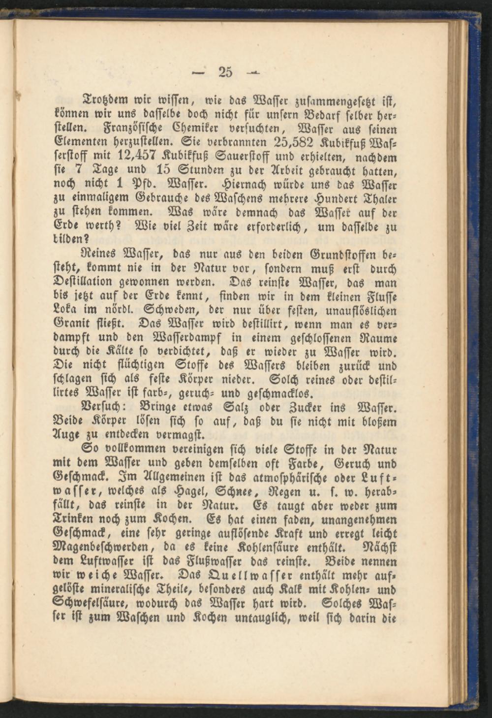 Trotzdem wir wissen, wie das Wasser zusammengesetzt ist, können wir uns dasselbe doch nicht für unsern Bedarf selber herstellen. Französische Chemiker versuchten, Wasser aus seinen Elementen herzustellen. Sie verbrannten 25,582 Kubikfuß Wasserstoff mit 12,457 Kubikfuß Sauerstoff und erhielten, nachdem sie 7 Tage und 15 Stunden zu der Arbeit gebraucht hatten, noch nicht 1 Psd. Wasser. Hiernach würde uns das Wasser zu einmaligem Gebrauche des Waschens mehrere Hundert Thaler zu stehen kommen. Was wäre demnach das Wasser auf der Erde werth? Wie viel Zeit wäre erforderlich, um dasselbe zu bilden?
