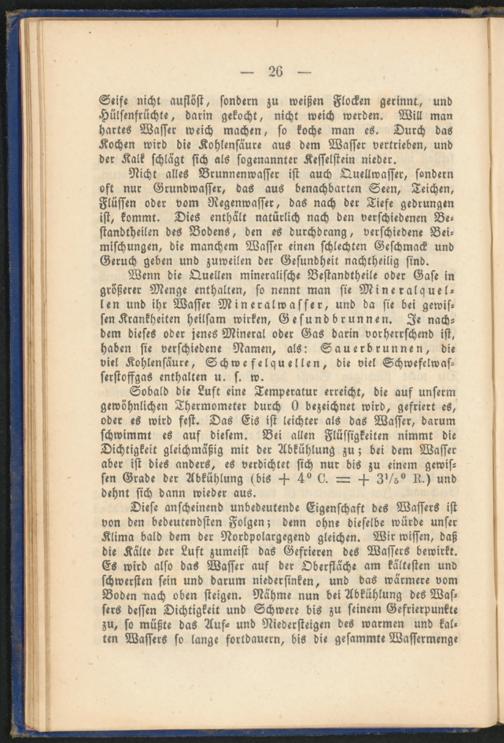 Sobald die Lust eine Temperatur erreicht, die auf unserm gewöhnlichen Thermometer durch 0 bezeichnet wird, gefriert es, oder es wird fest. Das Eis ist leichter als das Wasser, darum schwimmt es aus diesem. Bei allen Flüssigkeiten nimmt die Dichtigkeit gleichmäßig mit der Abkühlung zu; bei dem Wasser aber ist dies anders, es verdichtet sich nur bis zu einem gewissen Grade der Abkühlung (bis -s- 4° 6. -j- 3'/r° 1b.) und