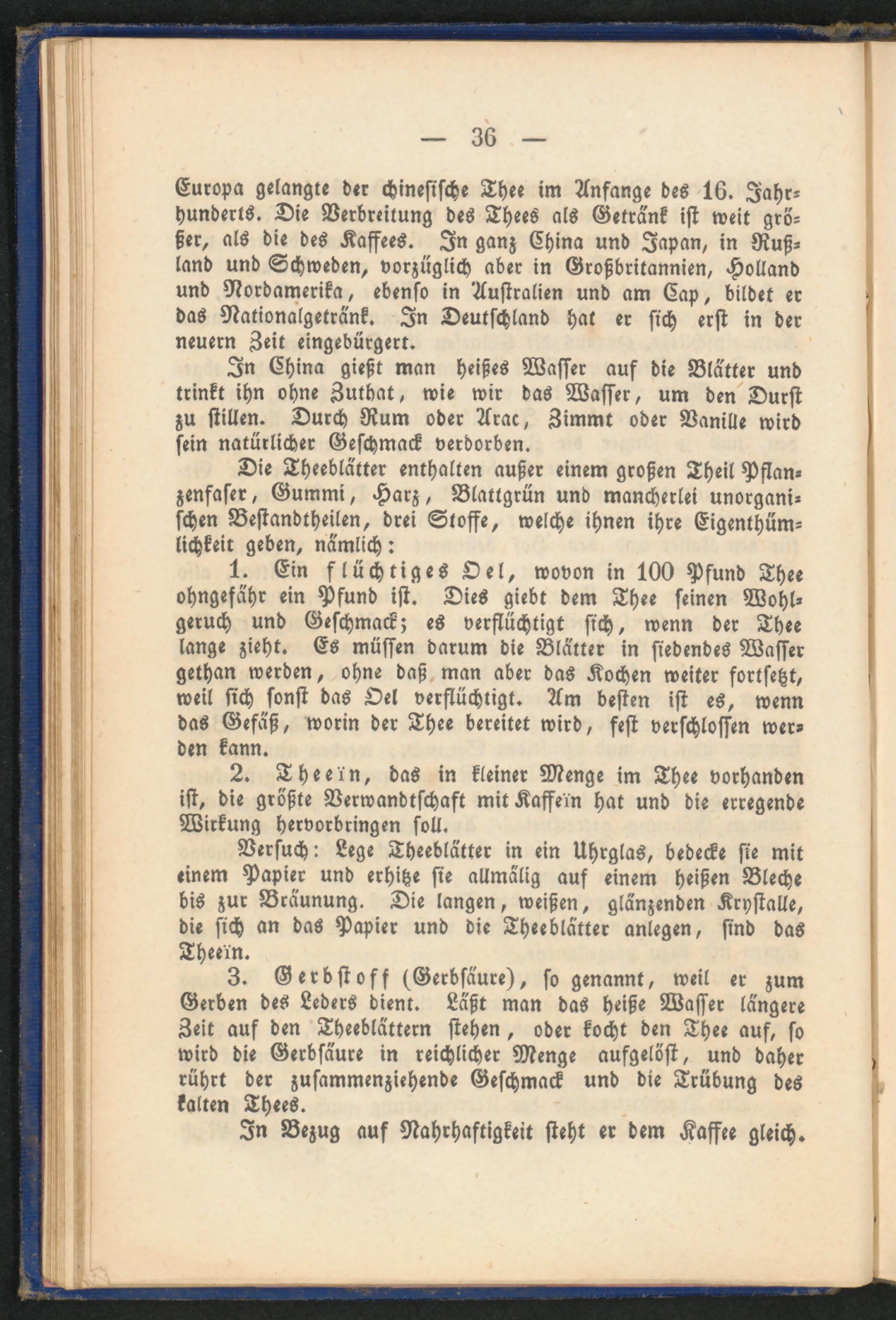 3. Gerbstoff (Gerbsäure), so genannt, weil er zum Gerben des Leders dient. Läßt man das heiße Wasser längere Zeit auf den Theeblättern stehen, oder kocht den Thee auf, so wird die Gerbsäure in reichlicher Menge aufgelöst, und daher rührt der zusammenziehende Geschmack und die Trübung des kalten Thees.