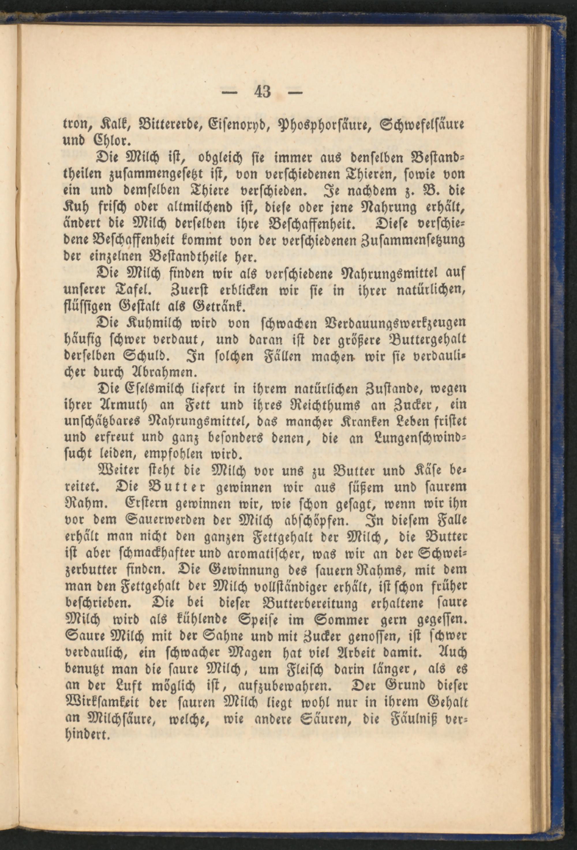 Die Milch ist, obgleich sie immer aus denselben Bestand- theilen zusammengesetzt ist, von verschiedenen Thieren, sowie von ein und demselben Thiere verschieden. Je nachdem z. B. die Kuh frisch oder altmilchend ist, diese oder jene Nahrung erhält, ändert die Milch derselben ihre Beschaffenheit. Diese verschie­dene Beschaffenheit kommt von der verschiedenen Zusammensetzung der einzelnen Bestandtheile her.
