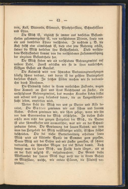 Die Kuhmilch wird von schwachen Verdauungswerkzeugen häufig schwer verdaut, und daran ist der größere Buttergehalt derselben Schuld. In solchen Fällen machen wir sie verdauli­cher durch Abrahmen.