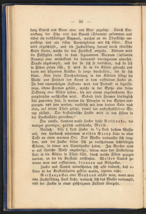 Versuch: Löse 1 Loth Zucker in Loth heißem Wasser auf, den hierdurch erhaltenen weißen Syrup stelle in einer Tasse an einen warmen Ort. Das Wasser verdunstet sich langsam, und der Zucker bildet sich zu verschobenen sechsseitigen Säulen, in denen wir Candiszucker haben. Im Großen wi»d er auf ähnliche Weise angefertigt, indem man den Zuckersyrup statt in die Kühler in Töpfe füllt, durch welche Fäden gezogen werden, an die die Krystalle anschießen. Weißen Eandis gewinnt man aus rafsinirtem, braunen aus Rohzucker.