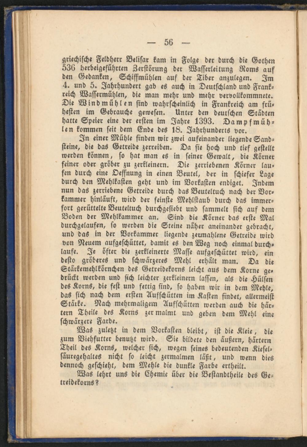 In einer Mühle finden wir zwei aufeinander liegende Sandsteine, die das Getreide zerreiben. Da sie hoch und tief gestellt werden können, so hat man es in seiner Gewalt, die Körner feiner oder gröber zu zerkleinern. Die zerriebenen Körner laufen durch eine Oeffnung in einen Beutel, der in schiefer Lage durch den Mehlkasten geht und im Verkästen endiget. Indem nun das zerriebene Getreide durch das Beuteltuch nach der Vorkammer hinläuft, wird der feinste Mehlstaub durch das immerfort gerüttelte Beutelluch durchgesiebt und sammelt sich auf dem Boden der Mehlkammer an. Sind die Körner das erste Mal durchgelaufen, so werden die Steine näher aneinander gebracht, und daS in der Vorkammer liegende zermahlene Getreide wird von Neuem aufgeschüttet, damit es den Weg noch einmal durchlaufe. Je öfter die zerkleinerte Masse aufgeschüttet wird, ein desto gröberes und schwärzeres Mehl erhält man. Da die Stärkemehlkörnchen des Getreidekorns leicht aus dem Korne gedrückt werden und sich leichter zerkleinern lassen, als die Hülsen