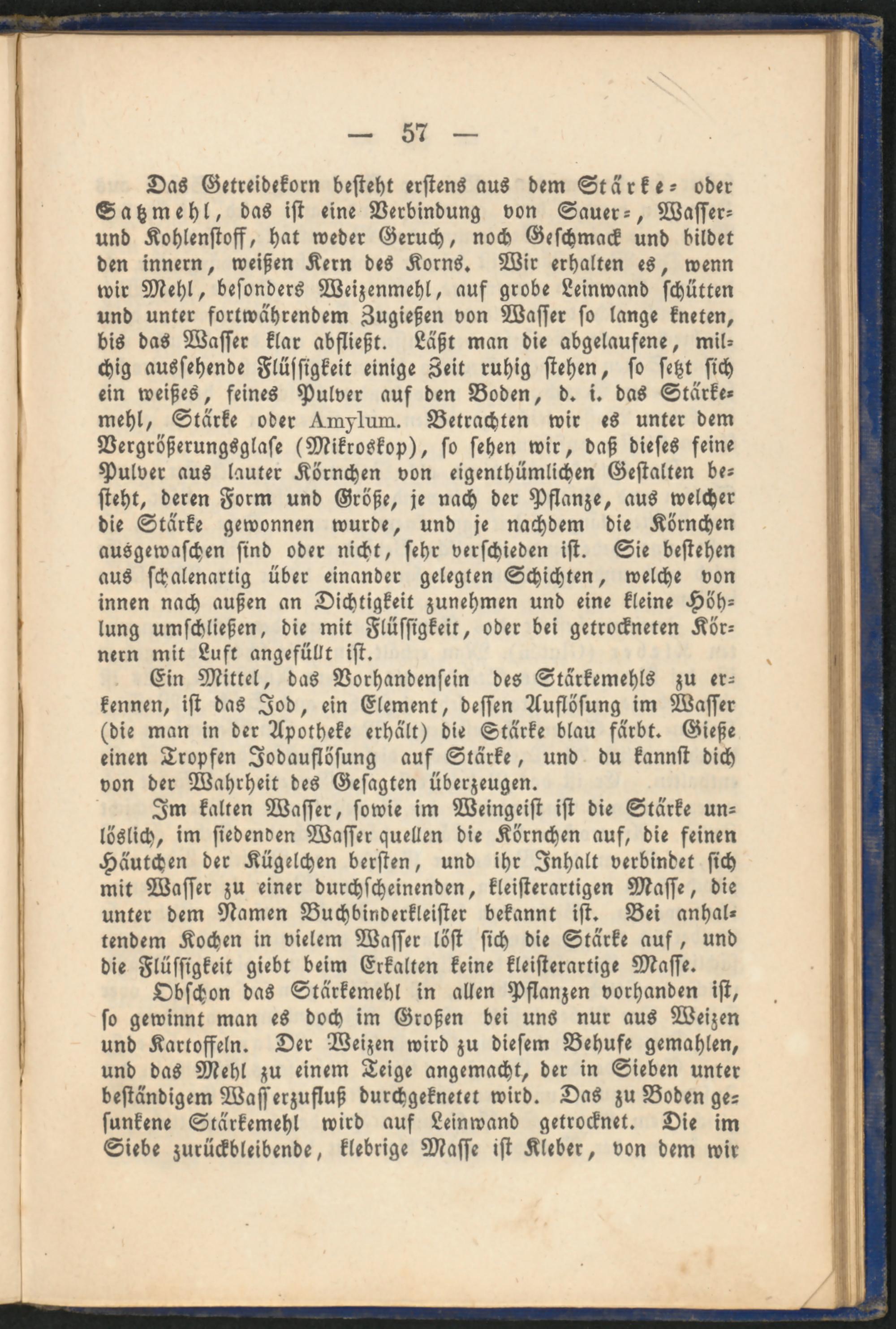 Das Getreidekorn besteht erstens aus dem Stärke- oder Eatzmehl, das ist eine Verbindung von Sauer-, Wafser- und Kohlenstoff, hat weder Geruch, noch Geschmack und bildet den innern, weißen Kern des Korns. Wir erhalten es, wenn wir Mehl, besonders Weizenmehl, auf grobe Leinwand schütten und unter fortwährendem Zugießen von Wasser so lange kneten, bis das Wasser klar abfließt. Läßt man die abgelaufene, milchig aussehende Flüssigkeit einige Zeit ruhig stehen, so setzt sich ein weißes, feines Pulver auf den Boden, d. i. das Stärkemehl, Stärke oder ^.m^luiu. Betrachten wir es unter dem Bergrößerungsglase (Mikroskop), so sehen wir, daß dieses feine Pulver aus lauter Körnchen von eigenthümlichen Gestalten besteht, deren Form und Größe, je nach der Pflanze, aus welcher die Stärke gewonnen wurde, und je nachdem die Körnchen ausgewaschen sind oder nicht, sehr verschieden ist. Sie bestehen aus schalenartig über einander gelegten Schichten, welche von innen nach außen an Dichtigkeit zunehmen und eine kleine Höhlung umschließen, die mit Flüssigkeit, oder bei getrockneten Körnern mit Lust angefüllt ist.