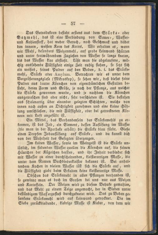 Ein Mittel, das Vorhandensein des Stärkemehls zu erkennen, ist das Jod, ein Element, dessen Auflösung im Wasser (die man in der Apotheke erhält) die Stärke blau färbt. Gieße einen Tropfen Jodauflösung auf Stärke, und du kannst dich von der Wahrheit des Gesagten überzeugen.