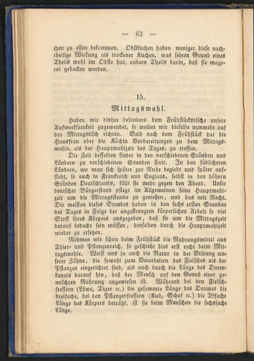 Die Zeit desselben findet in den verschiedenen Ständen und Ländern zu verschiedenen Stunden statt. In den südlicheren Ländern, wo man sich später zur Ruhe begiebt und später aufsteht, so auch in Frankreich und England, selbst in den Hähern Ständen Deutschlands, fällt sie mehr gegen den Abend. Unser deutscher Bürgerstand pflegt im Allgemeinen seine Hauptmahlzeit um die Mittagsstunde zu genießen, und das mit Recht. Die meisten dieses Standes haben in den sechs ersten Stunden des Tages in Folge der angestrengten körperlichen Arbeit so viel Stoff ihres Körpers ausgegeben, daß sie um die Mittagszeit darauf bedacht sein müssen, denselben durch die Hauptmahlzeit wieder zu ersetzen.
