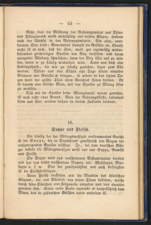 Nicht blos die Mischung der Nahrungsmittel aus Thier- und Pflanzenreich wirkt wohlthätig auf unsern Körper, sondern auch der Wechsel in den Nahrungsmitteln. Ein alter, anerkannter Satz heißt: Gewohnheit stumpft die Gefühle ab. Ebenso wahr ist es auch, daß die öfter, wohl gar regelmäßig wiederkehrenden gleichartigen Speisen den Reiz derselben und deren anregende Wirkung schwächen; denn der Reiz hört auf zu wirken, wenn er zu häufig wiederholt wird. Kann uns doch eine Lieblingsspeise, die wir zu häufig genießen, sogar zum Ekel werden. Würde uns eine Köchin acht Tage hinter einander Graupen mit Rindflei'ch bringen, so würde in den letzten Tagen wohl der größte Theil ihres Gerichtes stehen bleiben. Es ist darum eine löbliche Sitte, mit den Speisen zu Mittag öfter zu wechseln.