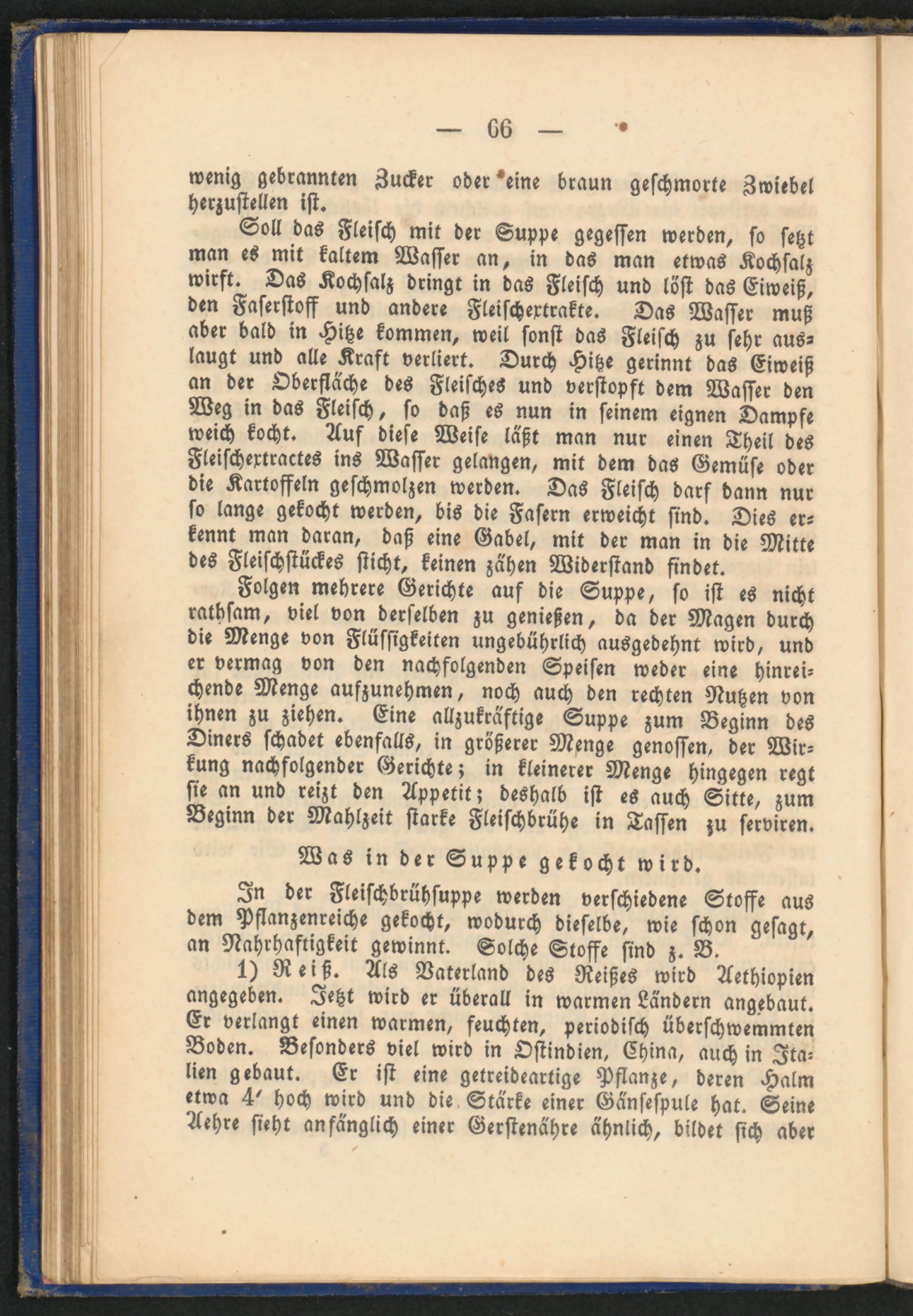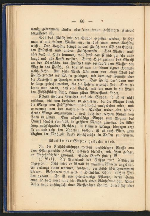 Folgen mehrere Gerichte aus die Suppe, so ist es nicht rathsam, viel von derselben zu genießen, da der Magen durch die Menge von Flüssigkeiten ungebührlich ausgedehnt wird, und er vermag von den nachfolgenden Speisen weder eine hinreichende Menge aufzunehmen, noch auch den rechten Nutzen von ihnen zu ziehen. Eine allzukrästige Suppe zum Beginn des Diners schadet ebenfalls, in größerer Menge genossen, der Wirkung nachfolgender Gerichte; in kleinerer Menge hingegen regt sie an und reizt den Appetit; deshalb ist es auch Sitte, zum Beginn der Mahlzeit starke Fleischbrühe in Tassen zu serviren.