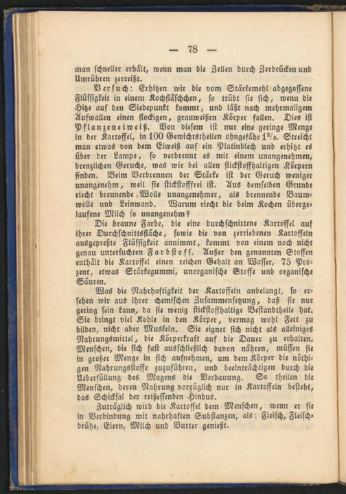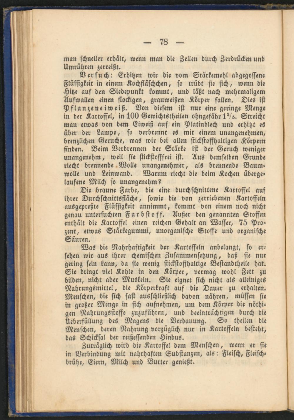 Versuch: Erhitzen wir die vom Stärkemehl abgegossene Flüssigkeit in einem Kochfläschchen, so trübt sie sich, wenn die Hitze aus den Siedepunkt kommt, und läßt nach mehrmaligem Aufwallen einen flockigen, grauweißen Körper fallen. Dies ist Pflanzeneiweiß. Von diesem ist nur eine geringe Menge in der Kartoffel, in 100 Gewichtstheilen ohngefähr 1?/». Streicht man etwas von dem Eiweiß auf ein Platinblech und erhitzt es über der Lampe, so verbrennt es mit einem unangenehmen, brenzlichen Gerüche, was wir bei allen stickstoffhaltigen Körpern finden. Beim Verbrennen der Stärke ist der Geruch weniger unangenehm, weil sie stickstofffrei ist. Aus demselben Grunde riecht brennende Wolle unangenehmer, als brennende Baumwolle und Leinwand. Warum riecht die beim Kochen übergelaufene Milch so unangenehm?