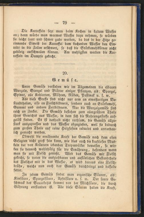 Unter Gemüse verstehen wir im Allgemeinen die eßbaren Wurzeln, Stengel und Blätter einiger Pflanzen, als: Spargel, Spinat, alle Kohlarten, Möhren, Rüben, Pastinak u. s. w.
