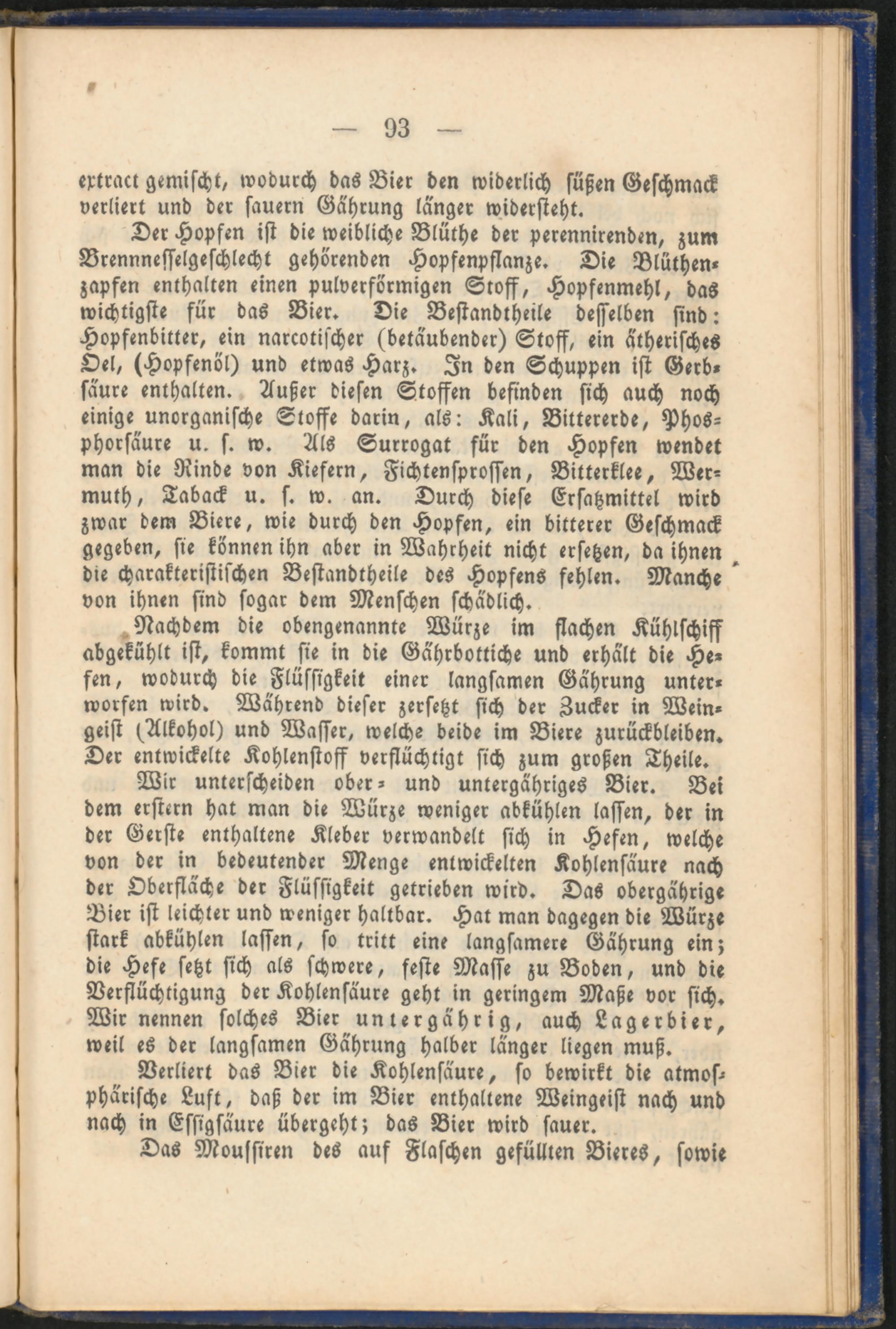 Der Hopfen ist die weibliche Blüthe der perennirenden, zum Brennnesselgeschlecht gehörenden Hopfenpflanze. Die Blüthen- zapfen enthalten einen pulverförmigen Stoff, Hopfenmehl, das wichtigste für das Bier. Die Bestandtheile desselben sind: Hopfenbitter, ein narcotischer (betäubender) Stoff, ein ätherisches Del, (Hopfenol) und etwas Harz. In den Schuppen ist Gerb­säure enthalten. Außer diesen Stoffen befinden sich auch noch einige unorganische Stoffe darin, als: Kali, Biltererde, Phos- phvrsäure u. s. w. Als Surrogat für den Hopfen wendet man die Rinde von Kiefern, Fichtensproffen, Bitterklee, Wer­muts», Taback u. s. w. an. Durch diese Ersatzmittel wird zwar dem Biere, wie durch den Hopfen, ein bitterer Geschmack gegeben, sie können ihn aber in Wahrheit nicht ersehen, da ihnen die charakteristischen Bestandtheile des Hopfens fehlen. Manche ' von ihnen sind sogar dem Menschen schädlich.