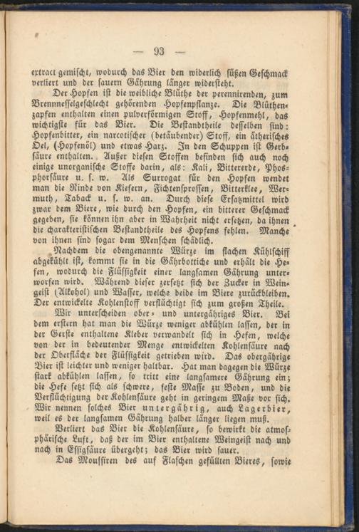 Wir unterscheiden ober- und untergähriges Bier. Bei dem erstem hat man die Würze weniger abkühlen lasten, der in der Gerste enthaltene Kleber verwandelt sich in Hefen, welche von der in bedeutender Menge entwickelten Kohlensäure nach der Oberfläche der Flüssigkeit getrieben wird. Das obergährige Bier ist leichter und weniger haltbar. Hat man dagegen die Würze stark abkühlen lassen, so tritt eine langsamere Gährung ein; die Hefe setzt sich als schwere, feste Masse zu Boden, und die Verflüchtigung der Kohlensäure geht in geringem Maße vor sich. Wir nennen solches Bier unlergährig, auch Lagerbier, weil es der langsamen Gährung halber länger liegen muß.