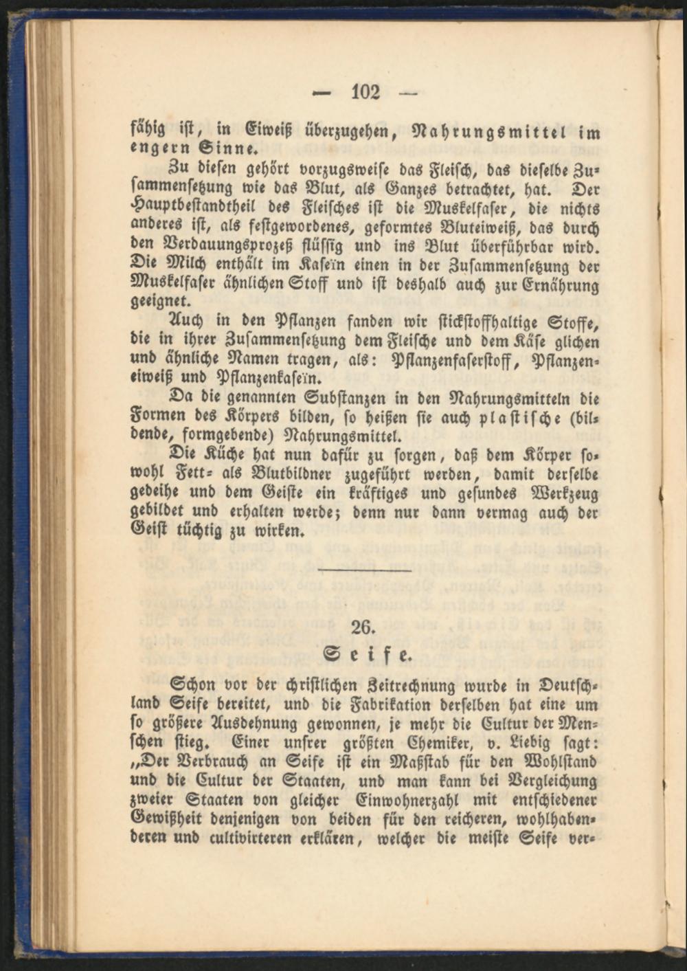Schon vor der christlichen Zeitrechnung wurde in Deutschland Seif« bereitet, und die Fabrikation derselben hat eine um so größere Ausdehnung gewonnen, je mehr die Cultur der Menschen stieg. Einer unsrer größten Chemiker, v. Liebig sagt: „Der Verbrauch an Seife ist ein Maßstab für den Wohlstand und die Cultur der Staaten, und man kann bei Vergleichung zweier Staaten von gleicher Einwohnerzahl mit entschiedener Gewißheit denjenigen von beiden für den reicheren, wohlhabendere« und cultivirteren erklären, weicher die meiste Seife ver-