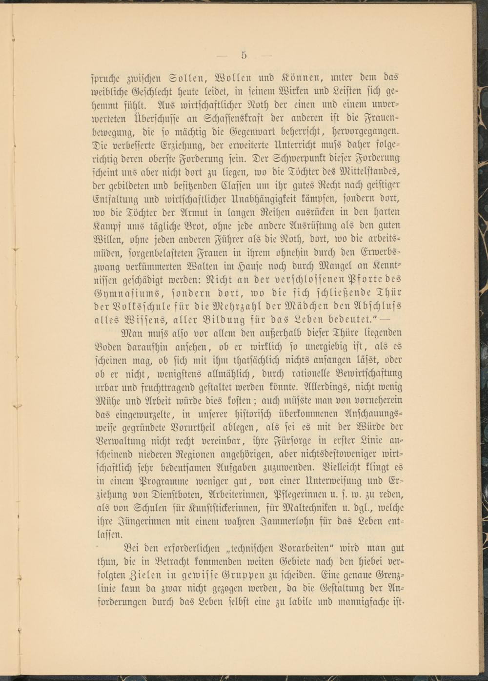 spruche zwischen Sollen, Wollen und Können, unter dem das weibliche Geschlecht heute leidet, in seinem Wirken und Leisten sich gehemmt suhlt. Aus wirtschaftlicher Noth der einen und einem unvermuteten Überschüsse an Schaffenskraft der anderen ist die Frauenbewegung, die so mächtig die Gegenwart beherrscht, hervorgegangen. Die verbesserte Erziehung, der erweiterte Unterricht muss daher folgerichtig deren oberste Forderung sein. Der Schwerpunkt dieser Forderung scheint uns aber nicht dort zu liegen, wo die Töchter des Mittelstandes, der gebildeten und besitzenden Classen um ihr gutes Recht nach geistiger Entfaltung und wirtschaftlicher Unabhängigkeit kämpfen, sondern dort, wo die Töchter der Armut in langen Reihen ausrücken in den harten Kamps ums tägliche Brot, ohne jede andere Ausrüstung als den guten Willen, ohne jeden anderen Führer als die Noth, dort, wo die arbeits- müden, sorgenbelasteten Frauen in ihrem ohnehin durch den Erwerbszwang verkümmerten Walten im Hause noch durch Mangel an Kenntnissen geschädigt werden: Nicht an der verschlossenen Pforte des Gymnasiums, sondern dort, wo die sich schließende Thür der Volksschule für die Mehrzahl der Mädchen den Abschluss alles Wissens, aller Bildung für das Leben bedeutet." —