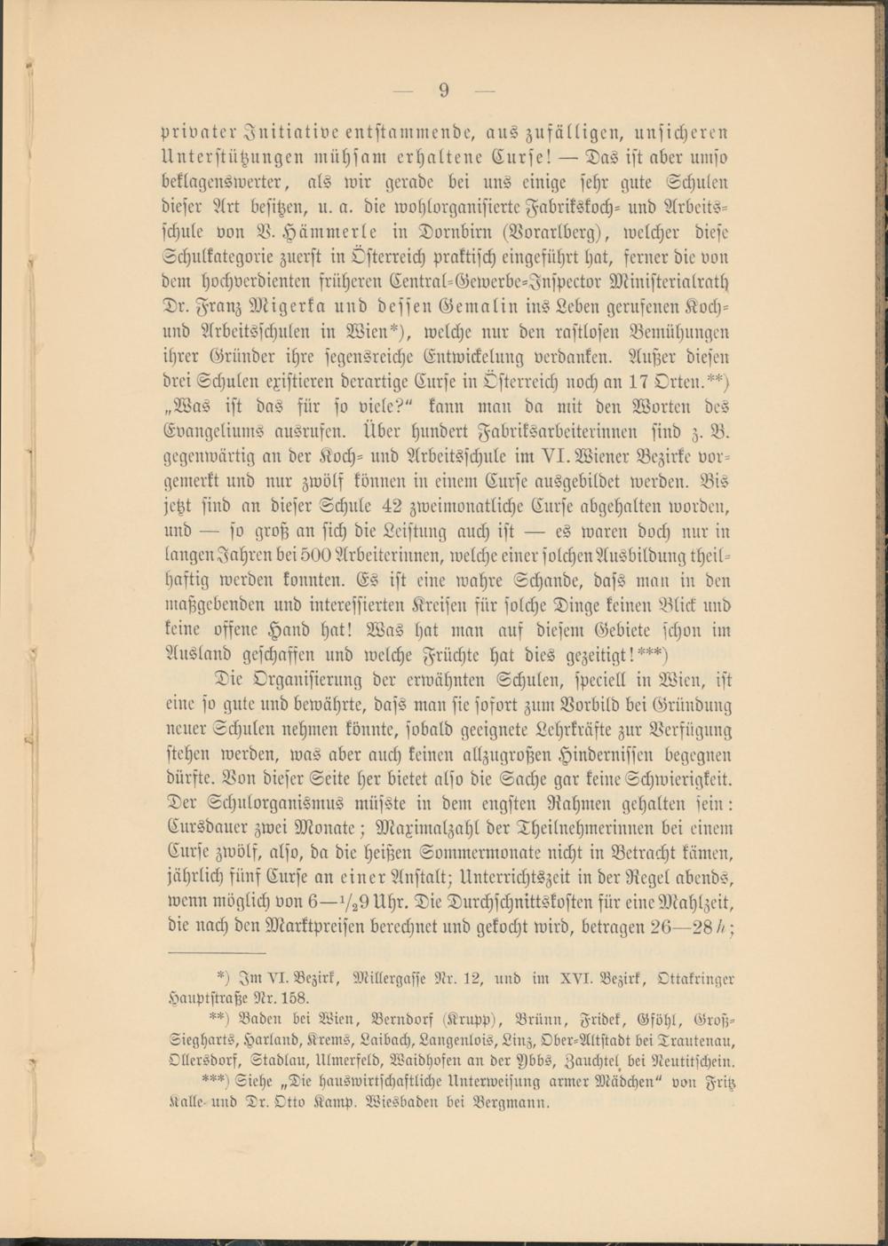 privater Initiative entstammende, aus zufälligen, unsicheren Unterstützungen mühsam erhaltene Curse! Das ist aber umso beklagenswerter, als wir gerade bei uns einige sehr gute Schuleu dieser Art besitzen, u. a. die wohlorganisierte Fabrikskoch- und Arbeits­schule von V. Hämmerle in Dornbirn (Vorarlberg), welcher diese Schulkategorie zuerst in Österreich praktisch eingeführt hat, ferner die von dem hochverdienten früheren Central-Gewerbe-Jnspector Ministerialrath Dr. Franz Migerka und dessen Gemalin ins Leben gerufenen Koch- und Arbeitsschulen in Wien*), welche nur den rastlosen Bemühungen ihrer Gründer ihre segensreiche Entwickelung verdanken. Außer diesen drei Schulen existieren derartige Curse in Österreich noch an 17 Orten.**) Was ist das für so viele?" kann man da mit den Worten des Evangeliums ausrufen. Über hundert Fabriksarbeiterinnen sind z. B. gegenwärtig an der Koch- und Arbeitsschule im VI. Wiener Bezirke vor­gemerkt und nur zwölf können in einem Curse ausgebildet werden. Bis jetzt sind an dieser Schule 42 zweimonatliche Curse abgehalten worden, und so groß an sich die Leistung auch ist es waren doch nur in langen Jahren bei 500 Arbeiterinnen, welche einer solchen Ausbildung theil­haftig werden konnten. Es ist eine wahre Schande, dass man in den maßgebenden und interessierten Kreisen für solche Dinge keinen Blick und keine offene Hand hat! Was hat man auf diesen: Gebiete schon im Ausland geschaffen und welche Früchte hat dies gezeitigt!***)
