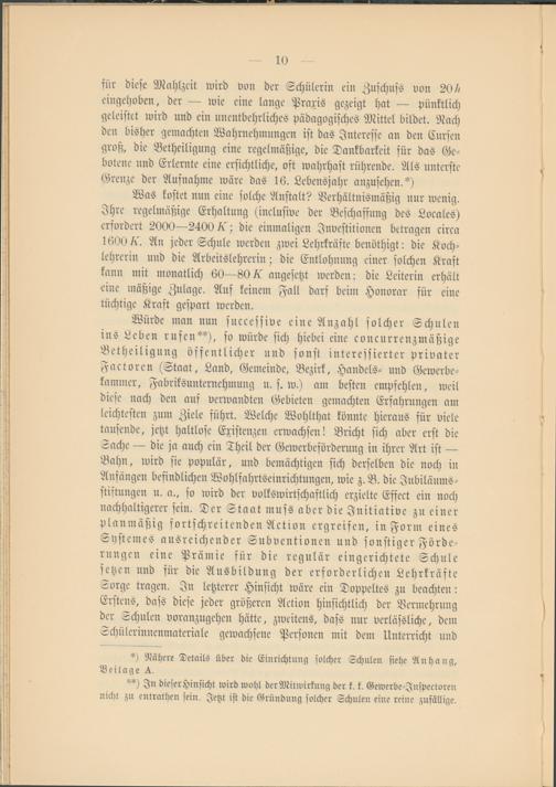 Würde man nun successive eine Anzahl solcher Schulen ins Leben rufen**), so würde sich Hiebei eine concurrenzmäßige Betheiligung öffentlicher und sonst interessierter privater Factoren (Staat, Land, Gemeinde, Bezirk, Handels- und Gewerbekammer, Fabriksunternehmung u. s. w.) am besten empfehlen, weil diese nach den auf verwandten Gebieten gemachten Erfahrungen am leichtesten zum Ziele führt. Welche Wohlthat könnte hieraus für viele taufende, jetzt haltlose Existenzen erwachsen! Bricht sich aber erst die Lache — die ja auch ein Theil der Gewerbeförderung in ihrer Art ist — Bahn, wird sie populär, und bemächtigen sich derselben die noch in Ansängen befindlichen Wohlfahrtseinrichtungen, wie z.B. die Jubiläumsstiftungen u. a., so wird der volkswirtschaftlich erzielte Effect ein noch nachhaltigerer sein. Der Staat muss aber die Initiative zu einer planmäßig fortschreitenden Action ergreifen, in Form eines Systemes ausreichender Subventionen und sonstiger Förderungen eine Prämie sür die regulär eingerichtete Schule setzen und sür die Ausbildung der erforderlichen Lehrkräfte Sorge tragen. In letzterer Hinsicht wäre ein Doppeltes zu beachten; Erstens, dass diese jeder größeren Action hinsichtlich der Vermehrung der Schulen voranzugehen hätte, zweitens, dass nur verlässliche, dem Schülerinuenmateriale gewachsene Personen mit dem Unterricht und