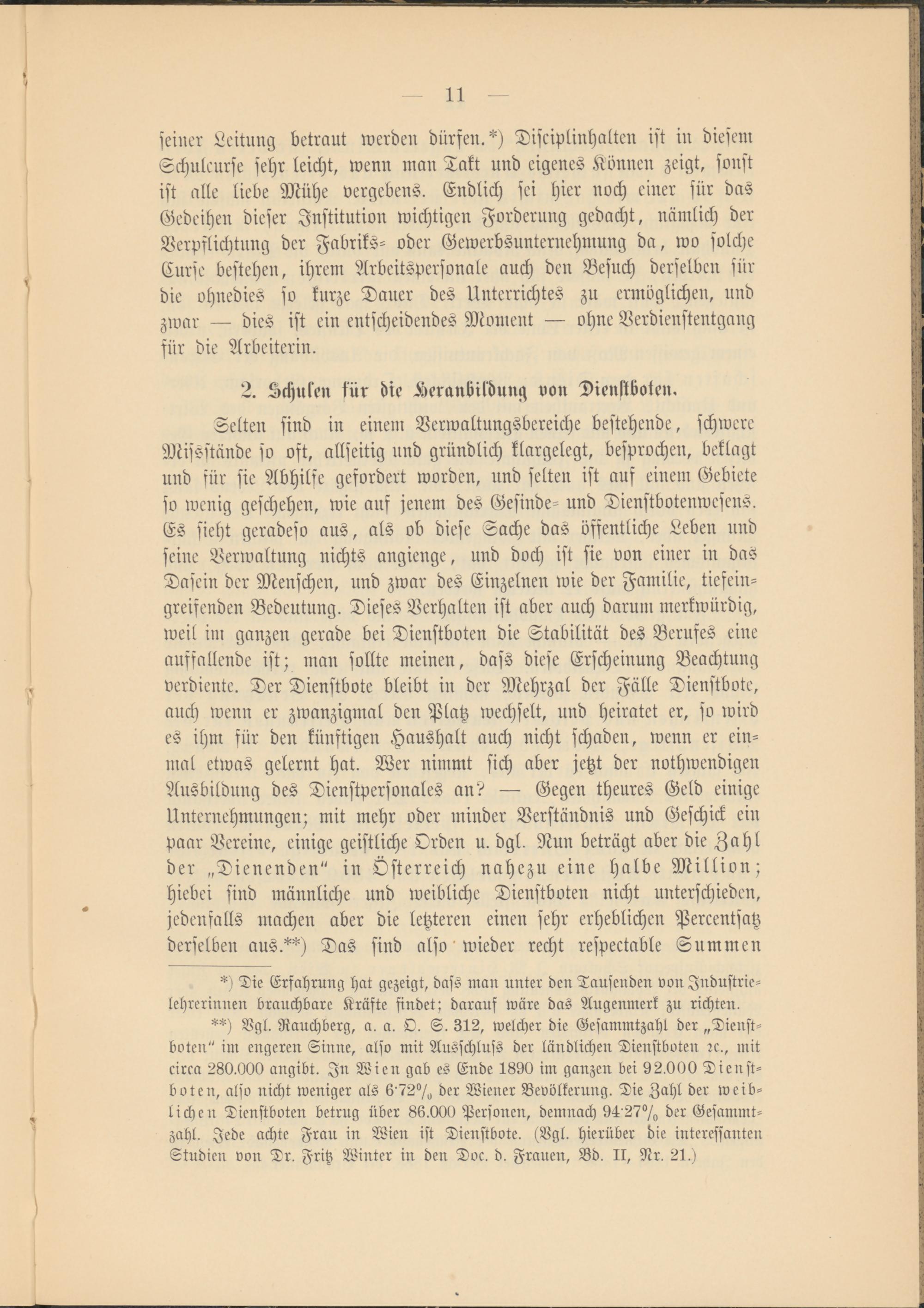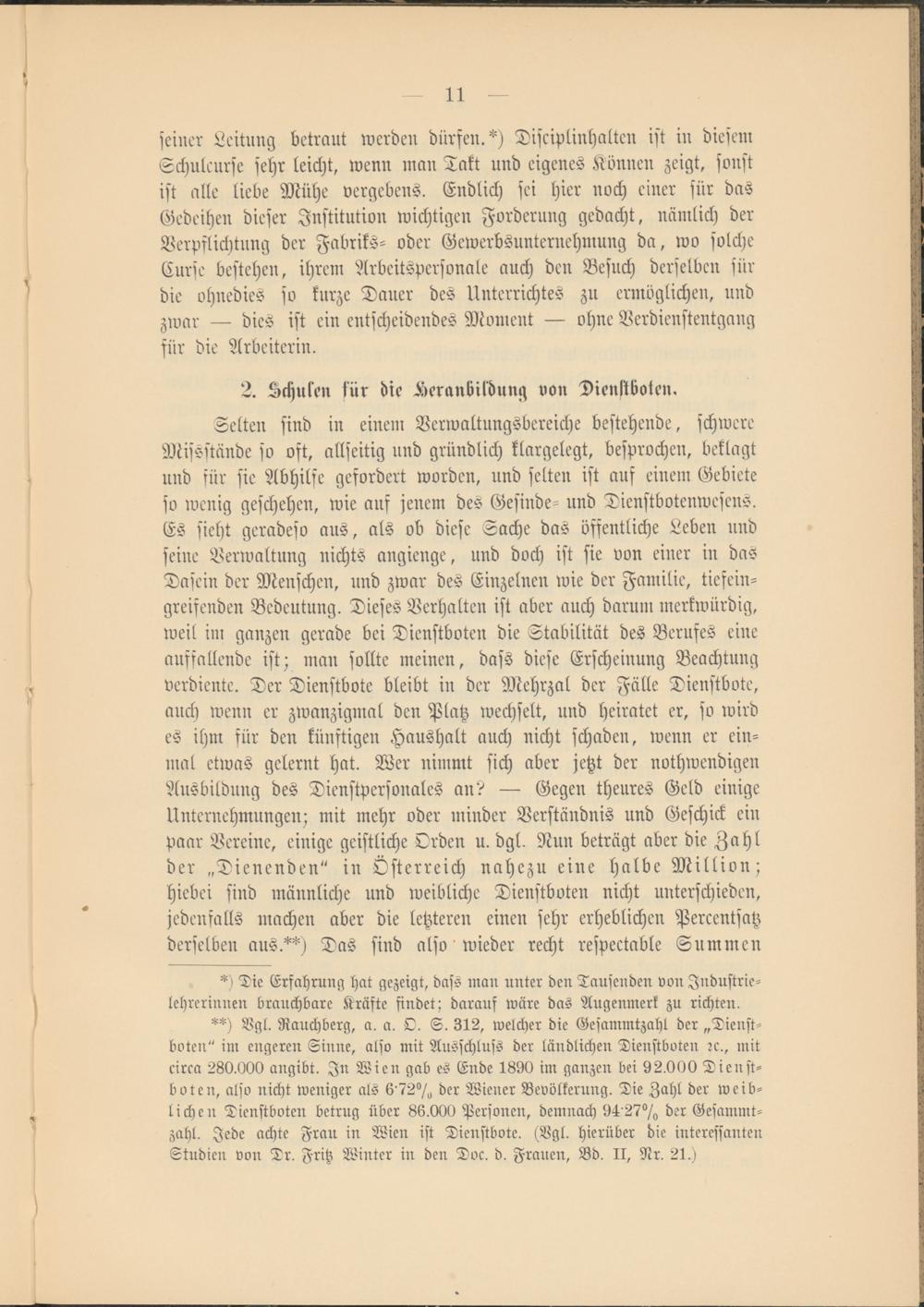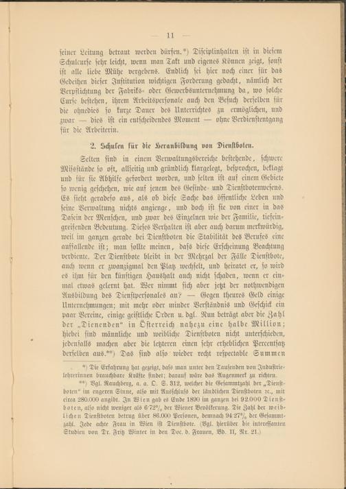 Selten sind in einem Verwaltungsbereiche bestehende, schwere Missstände so oft, allseitig und gründlich klargelegt, besprochen, beklagt und für sie Abhilfe gefordert worden, und selten ist auf einem Gebiete so wenig geschehen, wie auf jenem des Gesinde- und Tienstbotenwesens. Es sieht geradeso aus, als ob diese Sache das öffentliche Leben und seine Verwaltung nichts angienge, und doch ist sie von einer in das Dasein der Menschen, und zwar des Einzelnen wie der Familie, tiefein- greisenden Bedeutung. Dieses Verhalten ist aber auch darum merkwürdig, weit im ganzen gerade bei Dienstboten die Stabilität des Berufes eine ausfallende ist; man sollte meinen, dass diese Erscheinung Beachtung verdiente. Der Dienstbote bleibt in der Mehrzal der Fälle Dienstbote, auch wenn er zwanzigmal den Platz wechselt, und heiratet er, so wird es ihm für den künftigen Haushalt auch nicht schaden, wenn er ein­mal etwas gelernt hat. Wer nimmt sich aber jetzt der nothwendigen Ausbildung des Dienstpersonales an'? Gegen theures Geld einige Unternehmungen; mit mehr oder minder Verständnis und Geschick ein paar Vereine, einige geistliche Orden u. dgl. Nun beträgt aber die Zahl derDienenden" in Österreich nahezu eine halbe Million; Hiebei sind männliche und weibliche Dienstboten nicht unterschieden, jedenfalls machen aber die letzteren einen sehr erheblichen Percentsatz derselben aus.**) Das sind also wieder recht respektable Summen