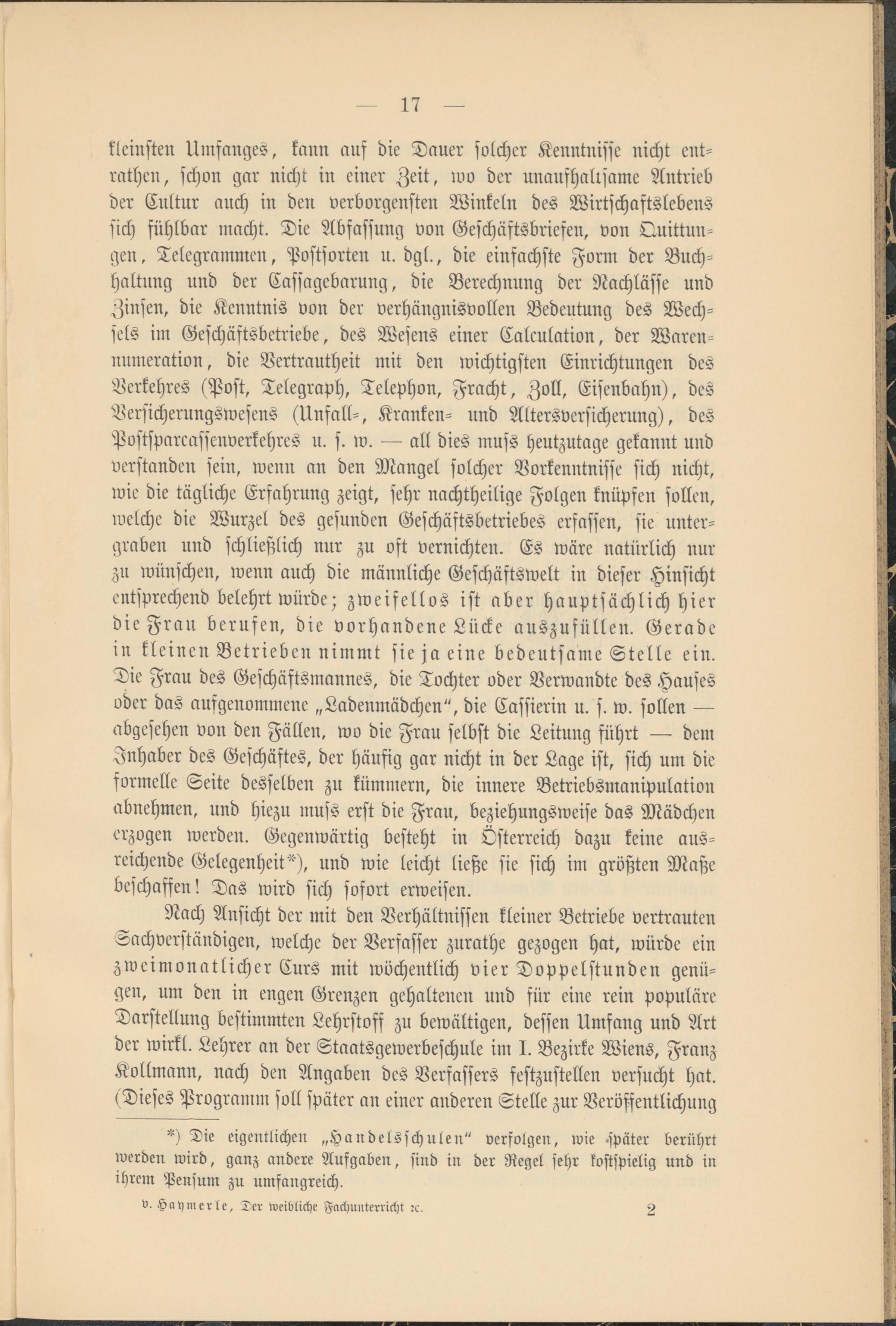kleinsten Umfanges, kann auf die Dauer solcher Kenntnisse nicht ent- rathen, schon gar nicht in einer Zeit, wo der unaufhaltsame Antrieb der Cultur auch in den verborgensten Winkeln des Wirtschaftslebens sich fühlbar macht. Die Abfassung von Geschäftsbriefen, von Quittun­gen , Telegrammen, Postsorten u. dgl., die einfachste Form der Buch­haltung und der Cassagebarung, die Berechnung der Nachlässe und Zinsen, die Kenntnis von der verhängnisvollen Bedeutung des Wech­sels im Geschäftsbetriebe, des Wesens einer Calculation, der Waren- numeration, die Vertrautheit mit den wichtigsten Einrichtungen des Verkehres (Post, Telegraph, Telephon, Fracht, Zoll, Eisenbahn), des Versicherungswesens (Unfall-, Kranken- und Altersversicherung), des Postsparcassenverkehres u. s. w. all dies muss heutzutage gekannt und verstanden sein, wenn an den Mangel solcher Vorkenntnisse sich nicht, wie die tägliche Erfahrung zeigt, sehr nachteilige Folgen knüpfen sollen, welche die Wurzel des gesunden Geschäftsbetriebes erfassen, sie unter­graben und schließlich nur zu oft vernichten. Es wäre natürlich nur zu wünschen, wenn auch die männliche Geschäftswelt in dieser Hinsicht entsprechend belehrt würde; zweifellos ist aber hauptsächlich hier die Frau berufen, die vorhandene Lücke auszufüllen. Gerade in kleinen Betrieben nimmt sie ja eine bedeutsame Stelle ein. Die Frau des Geschäftsmannes, die Tochter oder Verwandte des Hauses oder das aufgenommeneLadenmädchen", die Cassierin u. s. w. sollen abgesehen von den Fällen, wo die Frau selbst die Leitung führt dem Inhaber des Geschäftes, der häufig gar nicht in der Lage ist, sich um die formelle Seite desselben zu kümmern, die innere Betriebsmanipulation abnehmen, und hiezu muss erst die Frau, beziehungsweise das Mädchen erzogen werden. Gegenwärtig besteht in Österreich dazu keine aus­reichende Gelegenheit "), und wie leicht ließe sie sich im größten Maße beschaffen! Das wird sich sofort erweisen.