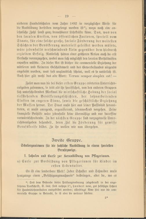 Fasst man nun die bei dieser ersten Gruppe erörterten Unterrichtsaufgaben zusammen, so tritt als ihr specifisches, von den anderen Gruppen sich unterscheidendes Merkmal die wirtschaftliche Hebung der social tiefstehenden Bevölkerungsschichten, der lohnarbeitenden Classen im engeren Sinne, sowie die geschäftliche Erziehung der Massen hervor. Der Staat muss hier aus seiner Passivität heraustreten, er muss anregend, organisierend, lebenweckend vorgehen. Seine finanzielle Beihilfe wäre jedenfalls keine übermäßige und nur successive vorwärtsschreitende. In der nächsten Gruppe sind vorzugsweise Unterrichtsaufgaben behandelt, deren Ziel die Förderung für gewisse Berufskreise bildet. Zu ihr wollen wir nun übergehen.