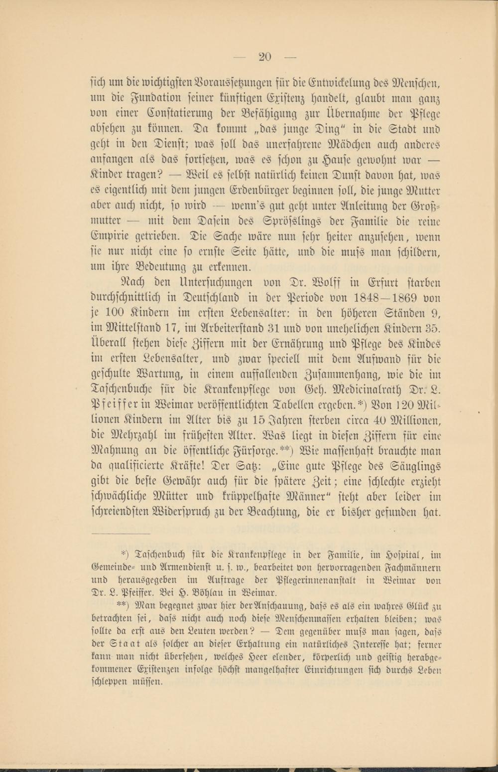 Nach den Untersuchungen von Dr. Wolfs in Erfurt starben durchschnittlich in Deutschland in der Periode von 1848 — 1869 von je 100 Kindern im ersten Lebensalter: in den höheren Stünden 9, im Mittelstand 17, im Arbeiterstand 31 und von unehelichen Kindern 35. Überall stehen diese Ziffern mit der Ernährung und Pflege des Kindes im ersten Lebensalter, und zwar speciell mit dem Auswand für die geschulte Wartung, in einem auffallenden Zusammenhang, wie die im Taschenbuche sür die Krankenpflege von Geh. Medicinalrath Dr. L. Pfeiffer in Weimar veröffentlichten Tabellen ergeben.*) Von 120 Millionen Kindern im Alter bis zu 15 Jahren sterben circa 40 Millionen, die Mehrzahl im frühesten Alter. Was liegt in diesen Ziffern für eine Mahnung an die öffentliche Fürsorge.**) Wie massenhaft brauchte man da qualificierte Kräfte! Der Satz: „Eine gute Pflege des Säuglings gibt die beste Gewähr auch für die spätere Zeit; eine schlechte erzieht schwächliche Mütter und krüppelhafte Männer" steht aber leider im schreiendsten Widerspruch zu der Beachtung, die er bisher gefunden hat.