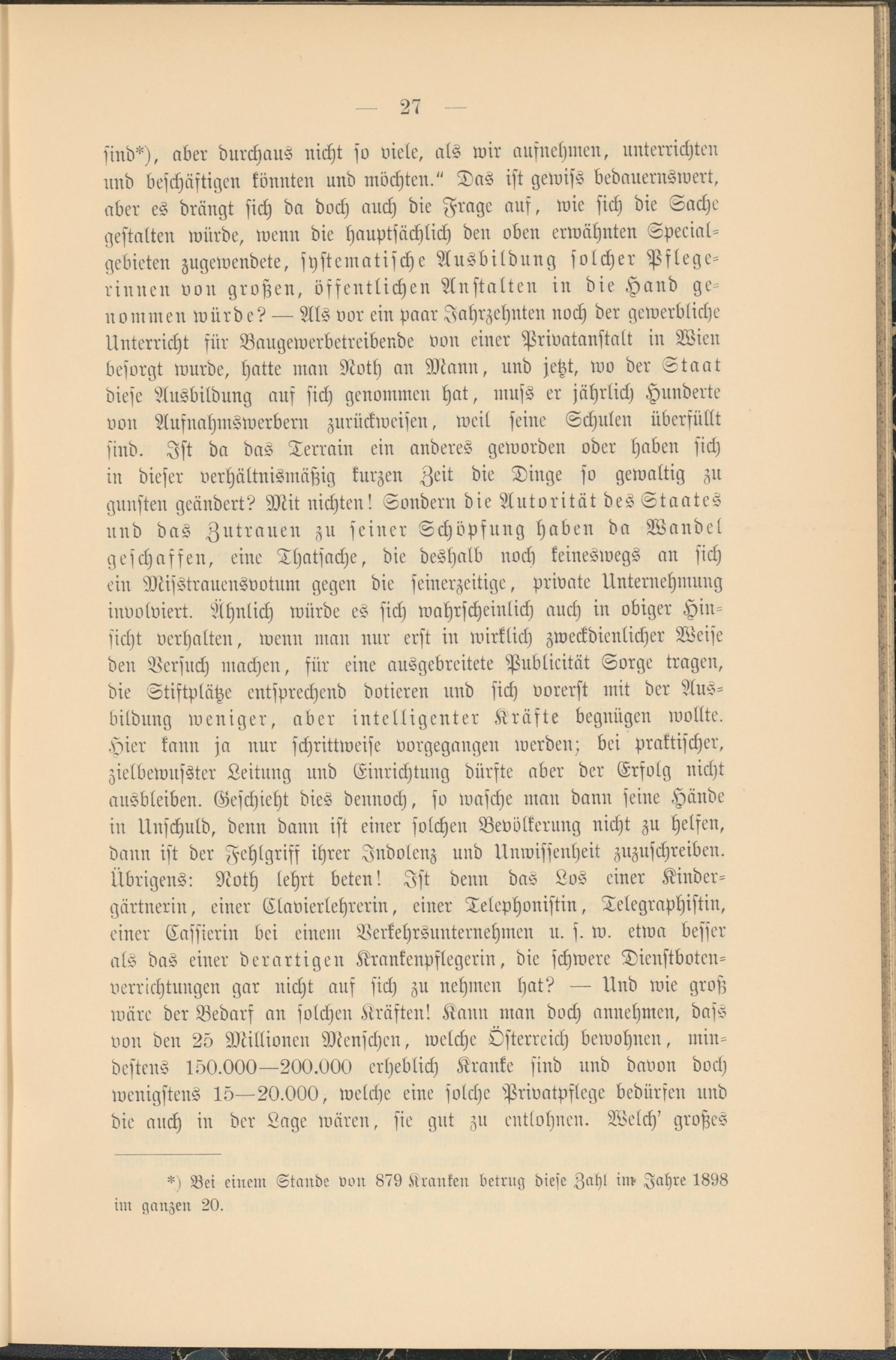 find*), aber durchaus nicht so viele, als wir aufnehmen, unterrichten und beschäftigen könnten und möchten." Das ist gewiss bedauernswert, aber es drängt sich da doch auch die Frage auf, wie sich die Sache gestalten wurde, wenn die hauptsächlich den oben erwähnten Special- gebieten zugewendete, systematische Ausbildung solcher Pflegerinnen von großen, öffentlichen Anstalten in die Hand genommen würde? — Als vor ein paar Jahrzehnten noch der gewerbliche Unterricht für Baugewerbetreibende von einer Privatanstalt in Wien besorgt wurde, hatte man Noth an Mann, und jetzt, wo der Staat diese Ausbildung auf sich genommen hat, muss er jährlich Hunderte von Aufnahmswerbern zurückweisen, weil seine Schulen überfüllt find. Ist da das Terrain ein anderes geworden oder haben sich in dieser verhältnismäßig kurzen Zeit die Dinge so gewaltig zu gunsten geändert? Mit Nichten! Sondern die Autorität des Staates und das Zutrauen zu seiner Schöpfung haben da Wandel geschaffen, eine Thatsache, die deshalb noch keineswegs an sich ein Misstrauensvotum gegen die seinerzeitige, private Unternehmung involviert. Ähnlich würde es sich wahrscheinlich auch in obiger Hinsicht verhalten, wenn man nur erst in wirklich zweckdienlicher Weise den Versuch machen, für eine ausgebreitete Publicität Sorge tragen, die Stiftplätze entsprechend dotieren und sich vorerst mit der Ausbildung weniger, aber intelligenter Kräfte begnügen wollte. Hier kann ja nur schrittweise vorgegangen werden; bei praktischer, zielbewusster Leitung und Einrichtung dürfte aber der Erfolg nicht ausbleiben. Geschieht dies dennoch, so wasche man dann seine Hände in Unschuld, denn dann ist einer solchen Bevölkerung nicht zu helfen, dann ist der Fehlgriff ihrer Indolenz und Unwissenheit zuzuschreiben. Übrigens: Noth lehrt beten! Ist denn das Los einer Kindergärtnerin, einer Clavierlehrerin, einer Telephonistin, Telegraphistin, einer Cassierin bei einem Verkehrsunternehmen u. s. w. etwa besser als das einer derartigen Krankenpflegerin, die schwere Dienstbotenverrichtungen gar nicht auf sich zu nehmen hat? — Und wie groß wäre der Bedarf an solchen Kräften! Kann man doch annehmen, dass von den 25 Millionen Menschen, welche Österreich bewohnen, mindestens 150.000—200.000 erheblich Kranke sind und davon doch wenigstens 15—20.000, welche eine solche Privatpflege bedürfen und die auch in der Lage wären, fie gut zu entlohnen. Welch' großes