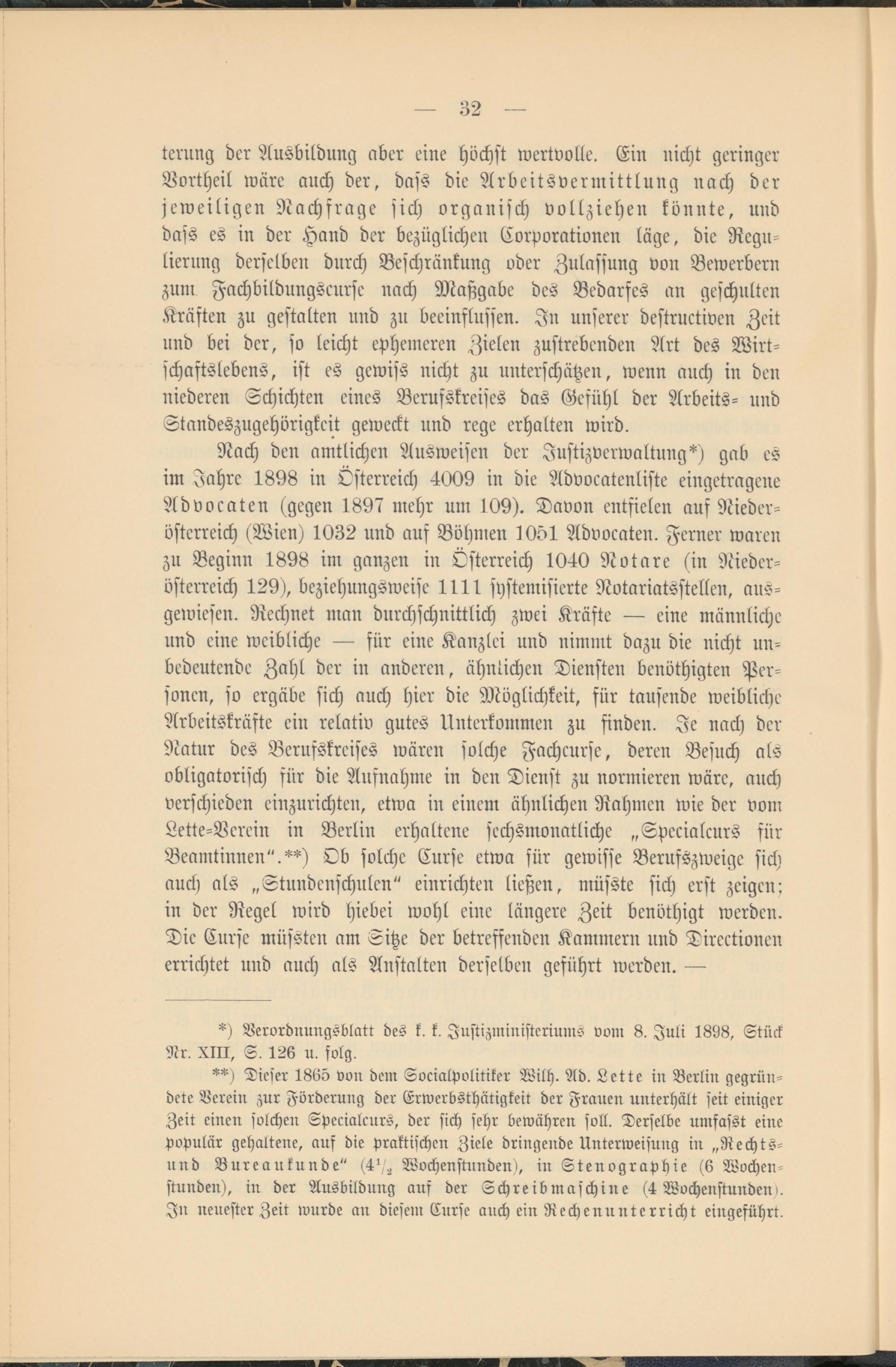 Nach den amtlichen Ausweisen der Justizverwaltung*) gab es im Jahre 1898 in Österreich 4009 in die Advocatenliste eingetragene Advocaten (gegen 1897 mehr um 109). Davon entfielen auf Nieder- österreich (Wien) 1032 und aus Böhmen 10ö1 Advocaten. Ferner waren zu Beginn 1898 im ganzen in Österreich 1040 Notare (in Nieder- österreich 129), beziehungsweise 1111 systemisierte Notariatsstellen, ausgewiesen. Rechnet man durchschnittlich zwei Kräfte — eine männliche und eine weibliche — für eine Kanzlei und nimmt dazu die nicht unbedeutende Zahl der in anderen, ähnlichen Diensten benöthigten Personen, so ergäbe sich auch hier die Möglichkeit, für taufende weibliche Arbeitskräfte ein relativ gutes Unterkommen zu finden. Je nach der Natur des Berufskreises wären solche Fachcurse, deren Besuch als obligatorisch für die Ausnahme in den Dienst zu normieren wäre, auch verschieden einzurichten, etwa in einem ähnlichen Rahmen wie der vom Lette-Verein in Berlin erhaltene sechsmonatliche „Specialcurs für Beamtinnen".**) Ob solche Curse etwa für gewisse Berufszweige sich auch als „Stundenschulen" einrichten ließen, müsste sich erst zeigen: in der Regel wird Hiebei wohl eine längere Zeit benöthigt werden. Die Curse müssten am Sitze der betreffenden Kammern und Direktionen errichtet und auch als Anstalten derselben geführt werden. —