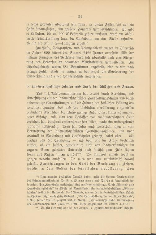 Im Post-, Telegraphen- und Telephondienst waren in Österreich im Jahre 1899 seitens des Staates 2422 Frauen angestellt. Mit der stetigen Zunahme des Verkehres wird sich jedenfalls auch eine Steige­rung des Bedarfes an derartigen Arbeitskräften herausstellen. Im Eisenbahndienst waren 684 Beamtinnen angestellt, eine relativ noch geringe Zahl. Auch sie müssen in der Regel die Absolvierung der Bürgerschule und einer Handelsschule nachweisen.