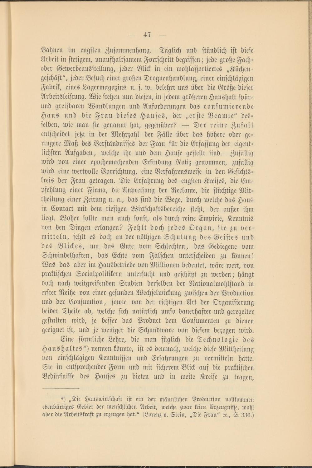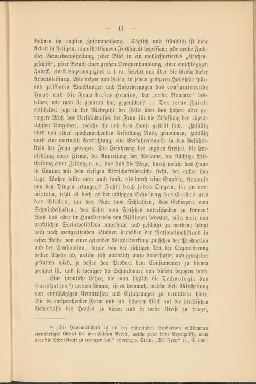*) „Die Hauswirtschaft ist ein der männlichen Production vollkommen ebenbürtiges Gebiet der menschlichen Arbeit, welche zwar keine Erzeugnisse, wohl aber die Arbeitskraft zu erzeugen hat." (Lorenz v. Stein, „Die Frau" rc., S. 336.)