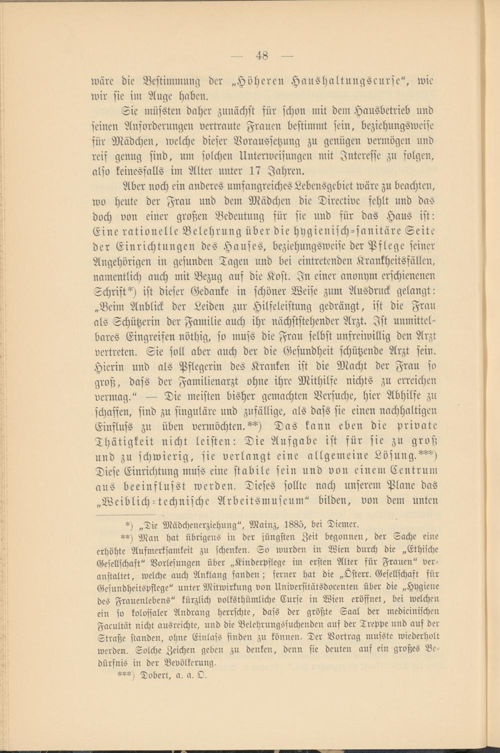 Aber noch ein anderes umsangreiches Lebensgebiet wäre zu beachten, wo heute der Frau und dem Mädchen die Direetive sehlt und das doch von einer großen Bedeutung für sie und sür das Haus ist: Eine rationelle Belehrung über die hygienisch-sanitäre Seite der Einrichtungen des Hauses, beziehungsweise der Pflege seiner Angehörigen in gesunden Tagen und bei eintretenden Krankheitsfällen, namentlich auch mit Bezug auf die Kost. In einer anonym erschienenen Schrift*) ist dieser Gedanke in schöner Weise zum Ausdruck gelangt: „Beim Anblick der Leiden zur Hilfeleistung gedrängt, ist die Frau als Schützern: der Familie auch ihr nächststehender Arzt. Ist unmittelbares Eingreifen nöthig, so muss die Frau selbst unfreiwillig den Arzt vertreten. Sie soll aber auch der die Gesundheit schützende Arzt sein. Hierin und als Pflegerin des Kranken ist die Macht der Frau so groß, dass der Familienarzt ohne ihre Mithilfe nichts zu erreichen vermag." — Die meisten bisher gemachten Versuche, hier Abhilfe zu schassen, sind zu singuläre und zufällige, als dass sie einen nachhaltigen Einfluss zu üben vermöchten.**) Das kann eben die private Thätigkeit nicht leisten: Die Ausgabe ist für sie zu groß und zu schwierig, sie verlangt eine allgemeine Lösung.***» Diese Einrichtung muss eine stabile sein und von einem Centrum aus beeinflusst werden. Dieses sollte nach unserem Plane das „Weiblich-technische Arbeitsmuseum" bilden, von dem unten
