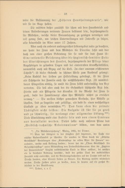 Sie müssten daher zunächst sür schon mit dem Hausbetrieb und seinen Ansorderungen vertraute Frauen bestimmt sein, beziehungsweise sür Mädchen, welche dieser Voraussetzung zu genügen vermögen und reis genug sind, um solchen Unterweisungen mit Interesse zu folgen, also keinesfalls im Alter unter 17 Jahren.