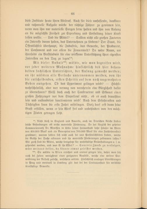 diese Institute heute ihren Weltruf. Auch für diese umfassende, dankbare und ruhmvolle Aufgabe würde der richtige Führer zu gewinnen sein, wenn man ihm nur materielle Sorgen ferne halten und ihm von Ansang an die möglichste Freiheit zur Erprobung und Entfaltung seiner Kraft lassen wollte. — Und die Mittel? — Sollten nicht alle großen Factoren ein Interesse daran haben, das Unternehmen zu fördern? Der Staat, die Öffentlichkeit überhaupt, die Industrie, das Gewerbe, der Producent, der Consument und vor allem die Frauenwelt? Da wäre Raum, um ihrerseits ein Verständnis für eine wirksame Unterstützung ihrer eigensten Interessen an den Tag zu legen!*)