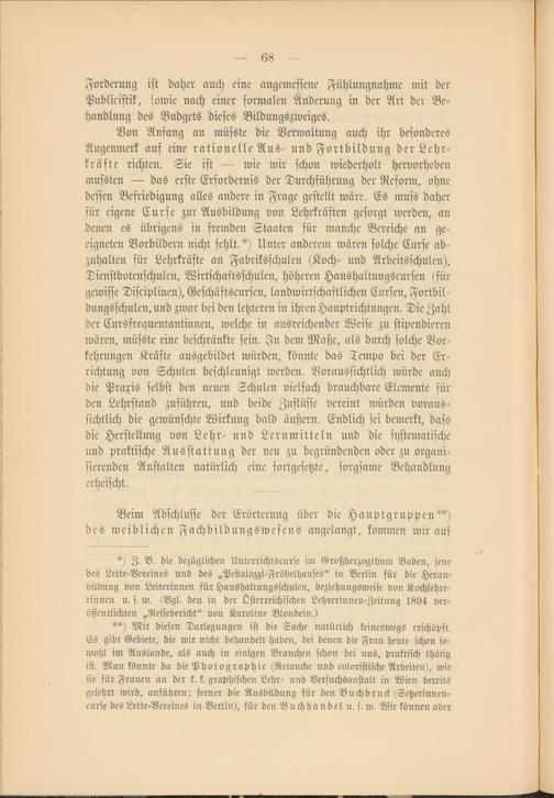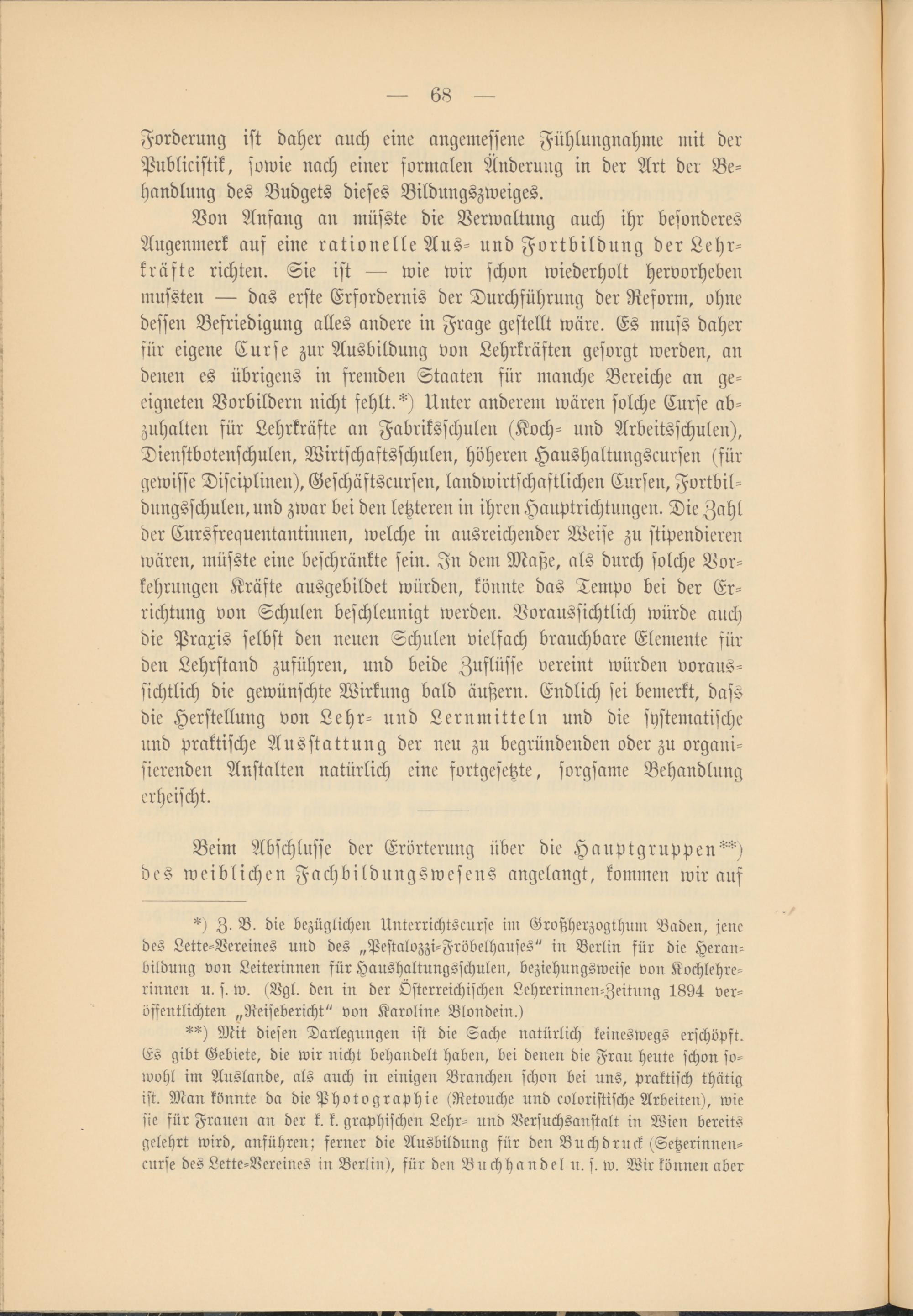 Von Anfang an musste die Verwaltung auch ihr besonderes Augenmerk auf eine rationelle Aus- und Fortbildung der Lehr­kräfte richten. Sie ist wie wir schon wiederholt hervorheben mussten das erste Erfordernis der Durchführung der Reform, ohne dessen Befriedigung alles andere in Frage gestellt wäre. Es muss daher für eigene Curse zur Ausbildung von Lehrkräften gesorgt werden, an denen es übrigens in fremden Staaten für manche Bereiche an ge­eigneten Vorbildern nicht fehlt. * **) ) Unter anderem wären solche Curse ab­zuhalten für Lehrkräfte an Fabriksschulen (Koch- und Arbeitsschulen), Dienstbotenschulen, Wirtschaftsschulen, höheren Haushaltungscursen (für gewisse Disciplinen), Geschäftscursen, landwirtschaftlichen Cursen, Fortbil­dungsschulen, und zwar bei den letzteren in ihren Hauptrichtungen. Die Zahl der Cursfrequentantinnen, welche in ausreichender Weise zu stipendieren wären, müsste eine beschränkte sein. In dem Maße, als durch solche Vor­kehrungen Kräfte ausgebildet würden, könnte das Tempo bei der Er­richtung von Schulen beschleunigt werden. Voraussichtlich würde auch die Praxis selbst den neuen Schulen vielfach brauchbare Elemente für den Lehrstand zuführen, und beide Zuflüsse vereint würden voraus­sichtlich die gewünschte Wirkung bald äußern. Endlich sei bemerkt, dass die Herstellung von Lehr- und Lernmitteln und die systematische und praktische Ausstattung der neu zu begründenden oder zu organi­sierenden Anstalten natürlich eine fortgesetzte, sorgsame Behandlung erheischt.