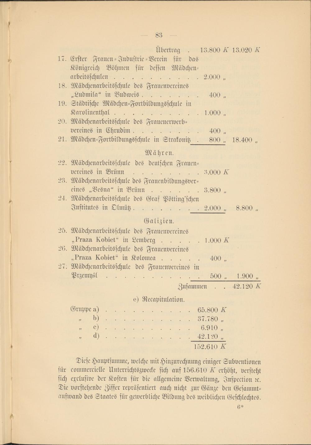 Diese Hauptsumme, welche mit Hinzurechnung einiger Subventionen nir commercielle Unterrichtszwecke sich auf 156.610 70 erhöht, versteht sich epclusive der Kosten für die allgemeine Verwaltung, Jnspcction w. Die vorstehende Ziffer repräsentiert auch nicht zur Gänze den Gesammt- anfwand des Staates für gewerbliche Bildung des weiblichen Geschlechtes.